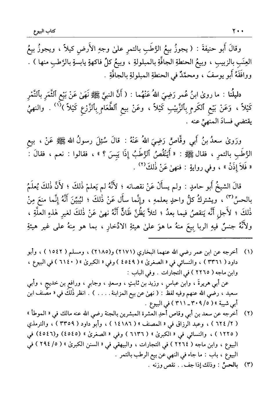 وروى سعد بن أبي وقاص - رَضِيَ اللَّهُ عَنْهُ -: قال «سُئل رسول الله - صَلَّى اللَّهُ عَلَيْهِ وَسَلَّمَ - عن بيع الرطب بالتمر، فقال - صَلَّى اللَّهُ عَلَيْهِ وَسَلَّمَ -: " أينقص الرطب إذا يبس؟ " فقالوا: نعم، فقال: " فلا إذن "، وفي رواية: فنهى عن ذلك» .