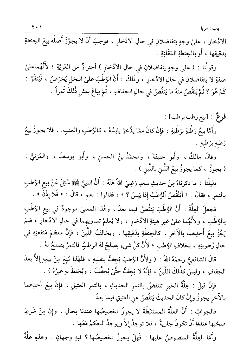 وأمَّا بيع رطبة برطبة، فإن كان مما يدخر يابسه، كالرطب والعنب.. فلا يجوز بيع رطبه برطبه.
