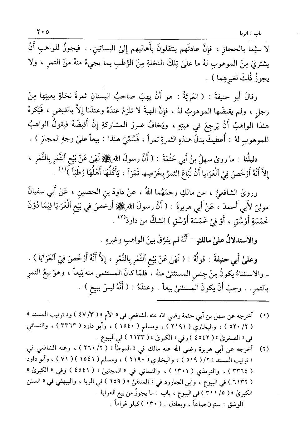 وروى الشافعي، عن مالك رحمهما الله، عن داود بن الحصين، عن أبي سفيان مولى لأبي أحمد، عن أبي هريرة: «أن رسول الله - صَلَّى اللَّهُ عَلَيْهِ وَسَلَّمَ - أرخص في بيع العرايا فيما دون خمسة أوسق، أو في خمسة أوسق» الشك من داود.