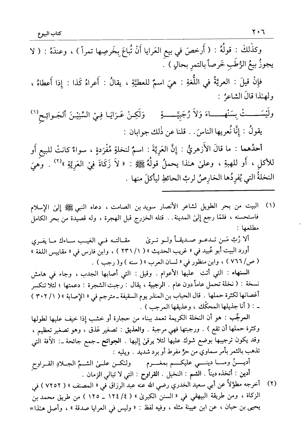 أحدهما: ما قال الأزهري: إن العرية: اسمٌ لنخلةٍ مفردةٍ، سواء كانت للبيع أو للأكل، أو للهبة، وعلى هذا يحمل قوله - صَلَّى اللَّهُ عَلَيْهِ وَسَلَّمَ -: «لا زكاة في العرية» . وهي النخلة التي يفردها الخارص لرب الحائط ليأكل منها.