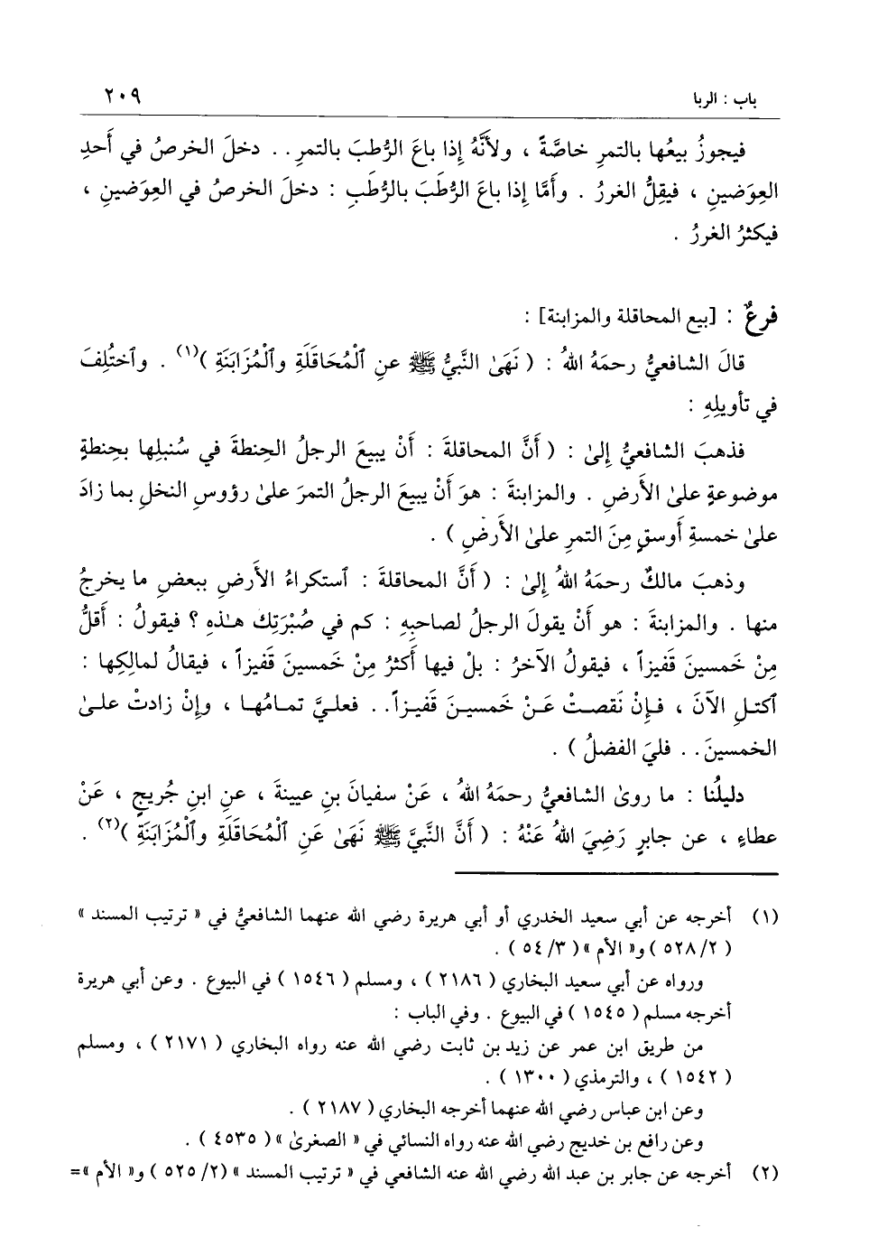 قال الشافعي - رَحِمَهُ اللَّهُ -: «نهى النبي - صَلَّى اللَّهُ عَلَيْهِ وَسَلَّمَ - عن المحاقلة والمزابنة» . واختلف في تأويله: