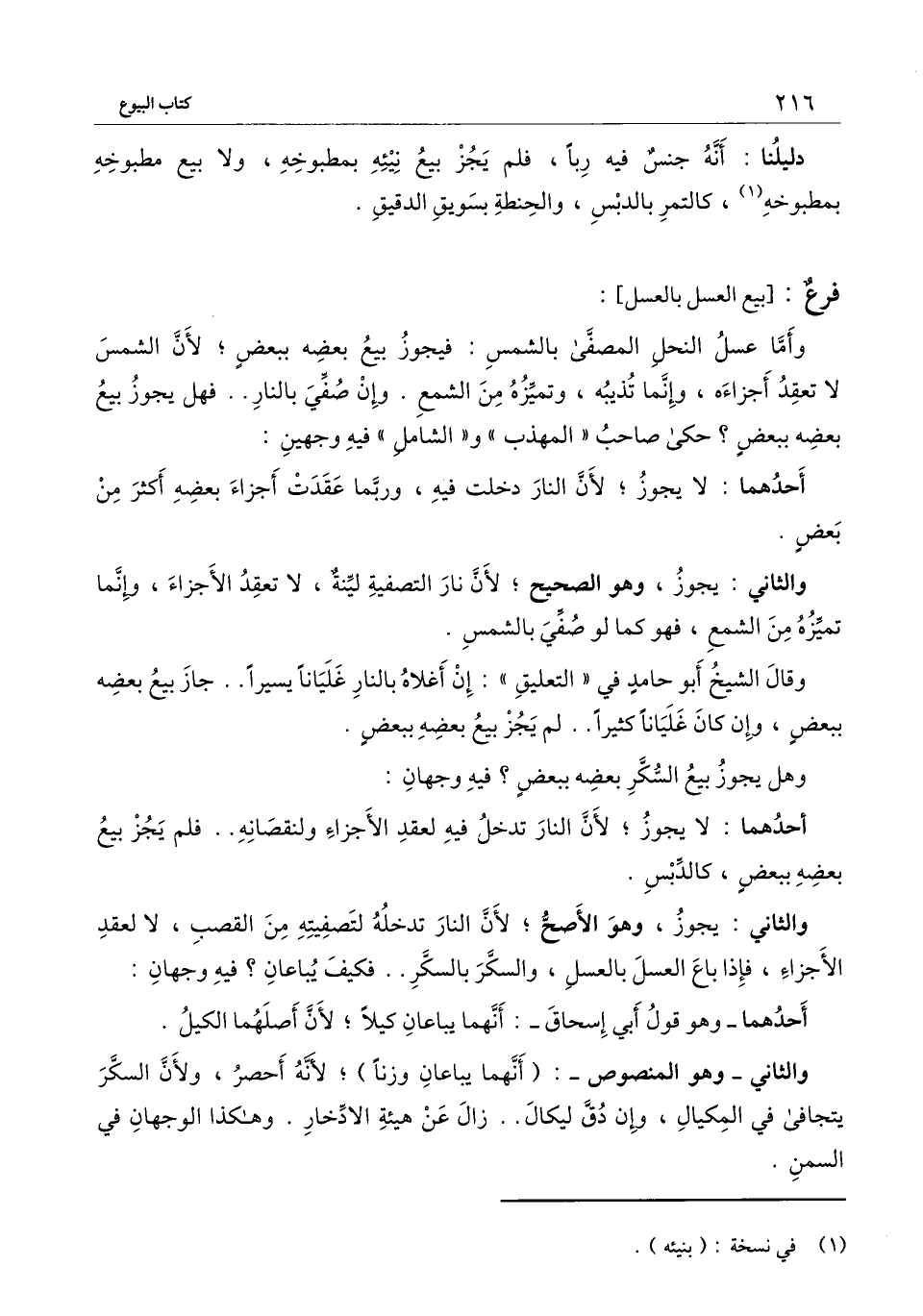 والثاني: يجوز، وهو الأصح؛ لأن النار تدخله لتصفيته من القصب، لا لعقد الأجزاء، فإذا باع العسل بالعسل، والسكر بالسكر.. فكيف يباعان؟ فيه وجهان: