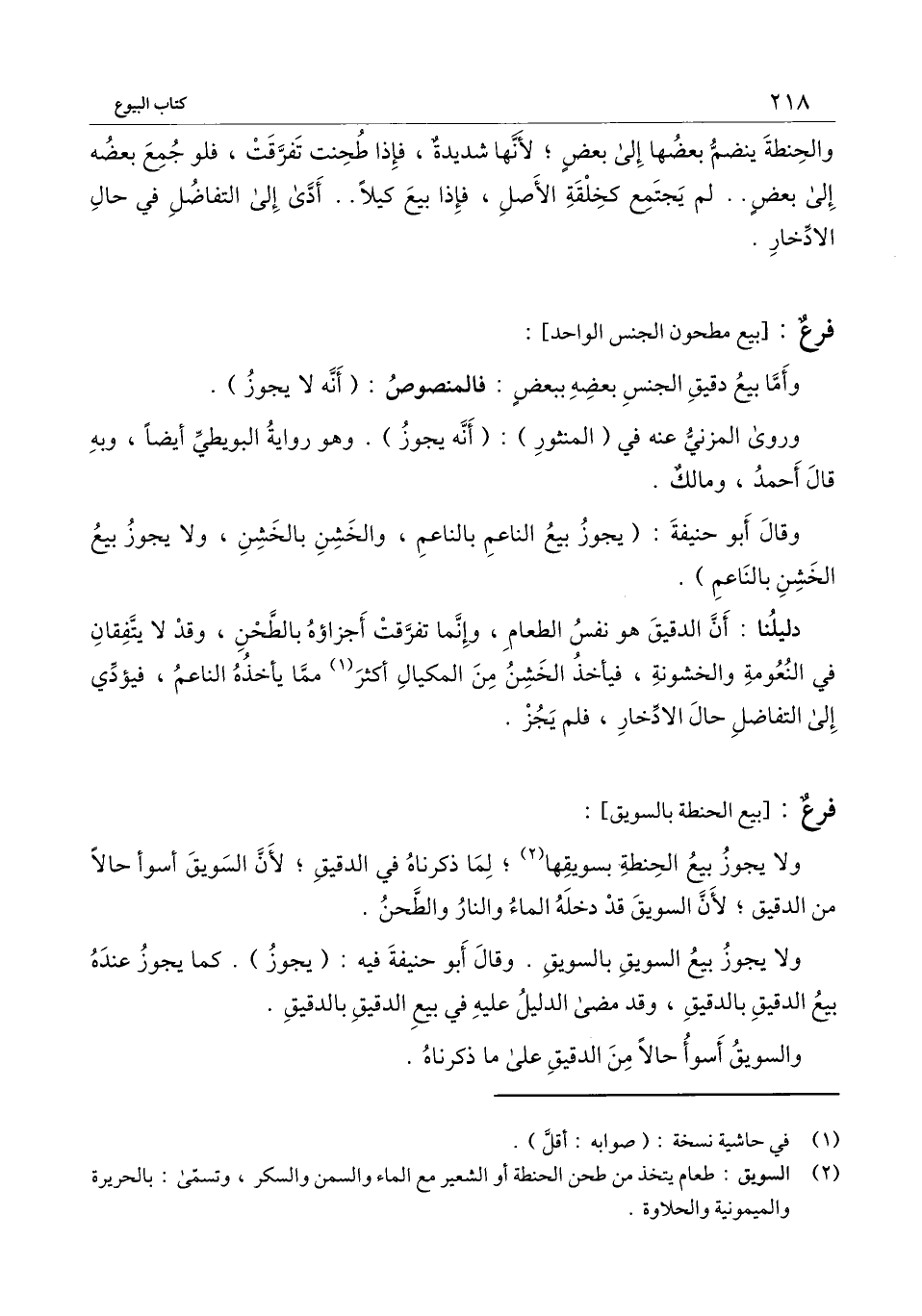 ] : وأما بيع دقيق الجنس بعضه ببعض: فالمنصوص: (أنه لا يجوز) .
