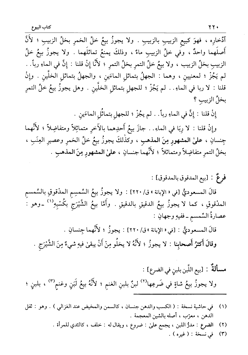 ادّخاره، فهو كبيع الزبيب بالزبيب. ولا يجوز بيع خل الخمر بخل الزبيب؛ لأن أصلهما واحد، وفي خل الزبيب ماء، وذلك يمنع تماثلهما. ولا يجوز بيع خل الزبيب بخل الزبيب، ولا بيع خل التمر بخل التمر؛ لأنّا إن قلنا: إن في الماء ربا.. لم يجز؛ لمعنيين، وهما: الجهل بتماثل الماءين، والجهل بتماثل الخلين. وإن قلنا: لا ربا في الماء.. لم يجز؛ للجهل بتماثل الخلين. وهل يجوز بيع خل التمر بخل الزبيب؟