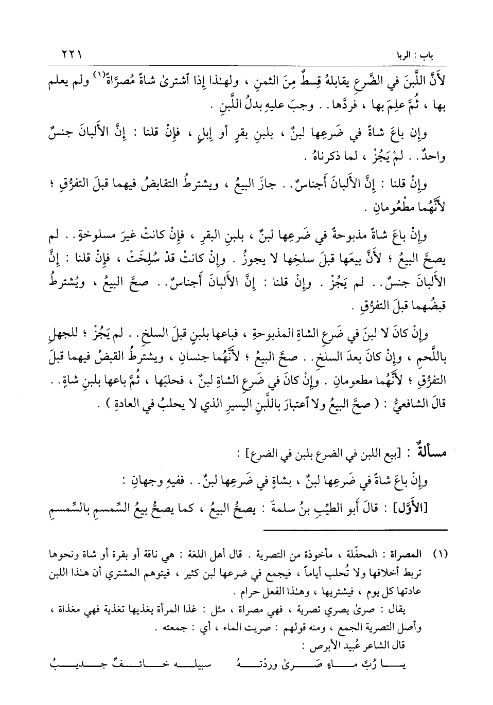 وإن كان لا لبن في ضرع الشاة المذبوحة، فباعها بلبن قبل السلخ.. لم يجز؛ للجهل باللحم، وإن كان بعد السلخ.. صح البيع؛ لأنهما جنسان، ويشترط القبض فيهما قبل التفرق؛ لأنهما مطعومان. وإن كان في ضرع الشاة لبن، فحلبها، ثم باعها بلبن شاةٍ.. قال الشافعي: (صح البيع ولا اعتبار باللبن اليسير الذي لا يحلب في العادة) .