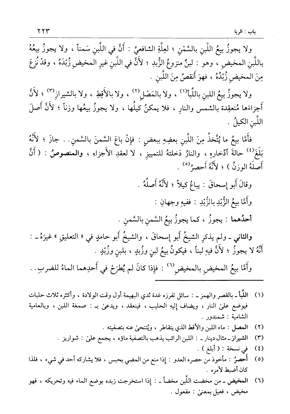 ولا يجوز بيع اللبن بالسمن؛ لعلة الشافعي: أن في اللبن سمنًا، ولا يجوز بيعه باللبن المخيض، وهو: لبن منزوع الزبد؛ لأن في اللبن غير المخيض زبده، وقد نزع من المخيض زبده، فهو أنقص من اللبن.