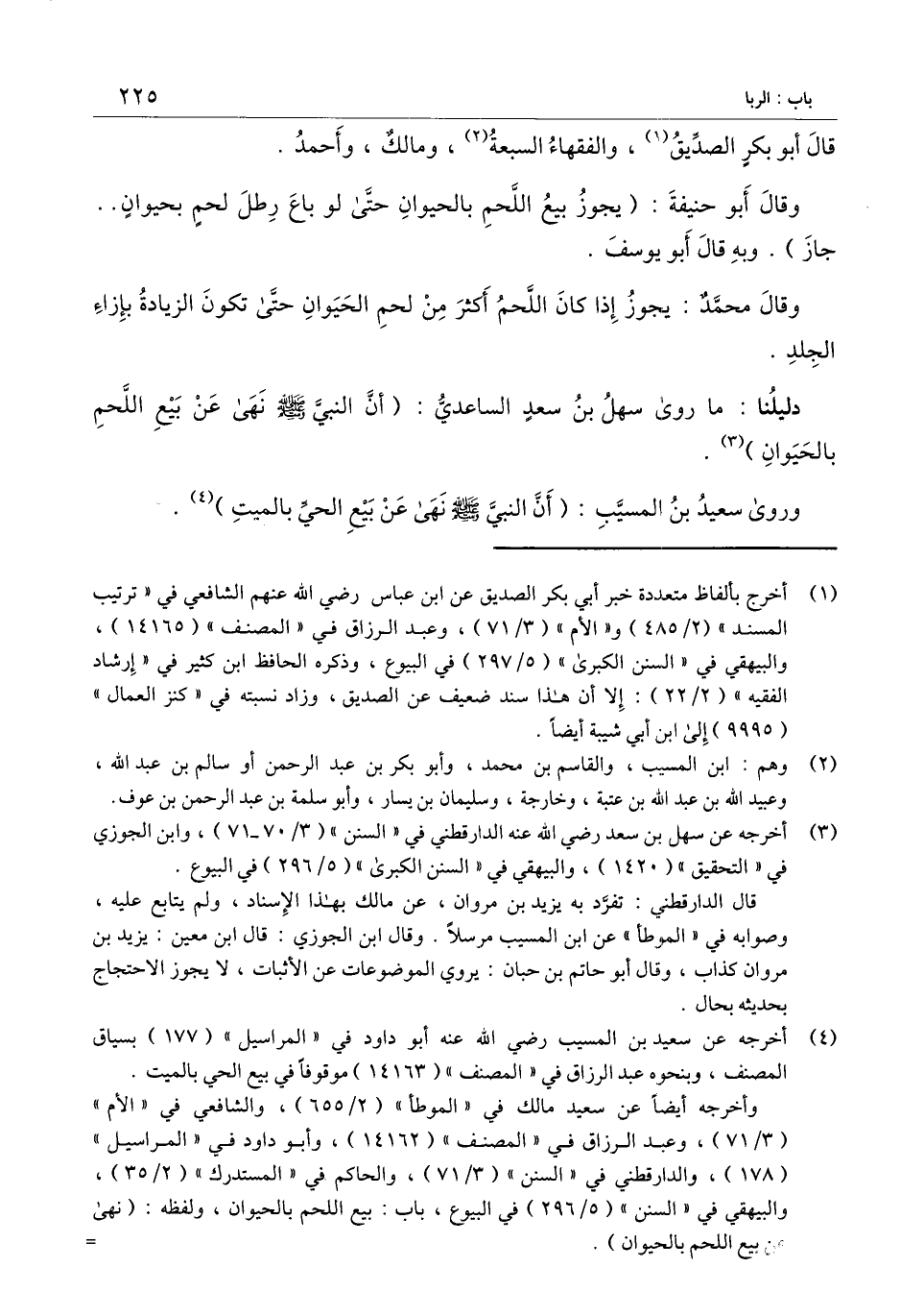 وقال أبو حنيفة: (يجوز بيع اللحم بالحيوان حتى لو باع رطل لحم بحيوان.. جاز) . وبه قال أبو يوسف.