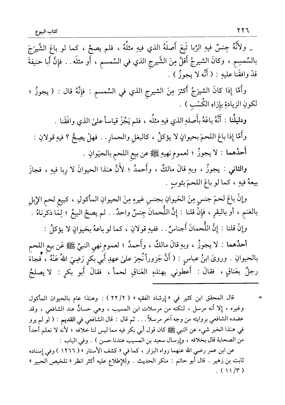 أحدهما: لا يجوز، وبه قال مالك، وأحمد؛ لعموم نهي النبي - صَلَّى اللَّهُ عَلَيْهِ وَسَلَّمَ - عن بيع اللحم بالحيوان. وروى ابن عباس: (أن جزورًا نُحِر على عهد أبي بكر - رَضِيَ اللَّهُ عَنْهُ -، فجاء رجل بعناق، فقال: أعطوني بهذه العناق لحمًا، فقال أبو بكر: لا يصلح