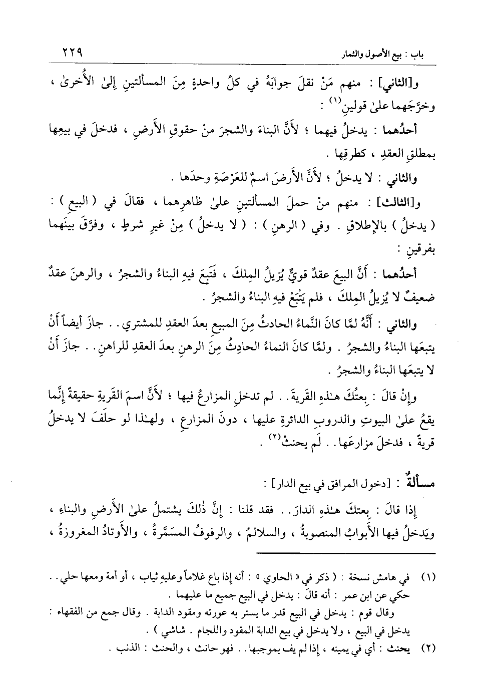 ] : إذا قال: بعتك هذه الدار.. فقد قلنا: إن ذلك يشتمل على الأرض والبناء، ويدخل فيها الأبواب المنصوبة، والسلالم، والرفوف المسمرة، والأوتاد المغروزة،