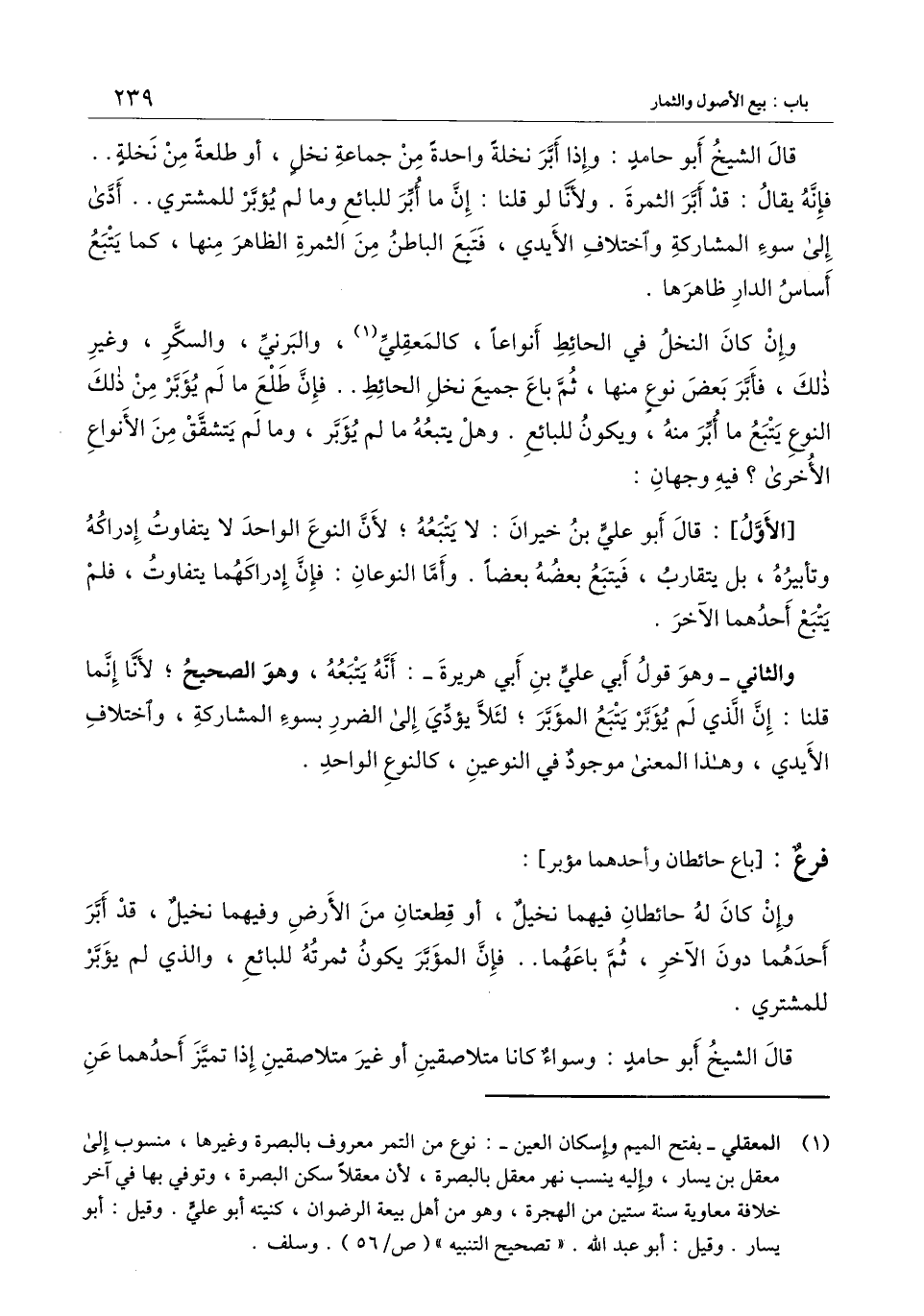 وإن كان النخل في الحائط أنواعًا، كالمعقلي، والبرني، والسكر، وغير ذلك، فأبر بعض نوع منها، ثم باع جميع نخل الحائط.. فإن طلع ما لم يؤبر من ذلك النوع يتبع ما أبر منه، ويكون للبائع. وهل يتبعه ما لم يؤبر، وما لم يتشقق من الأنواع الأخرى؟ فيه وجهان: