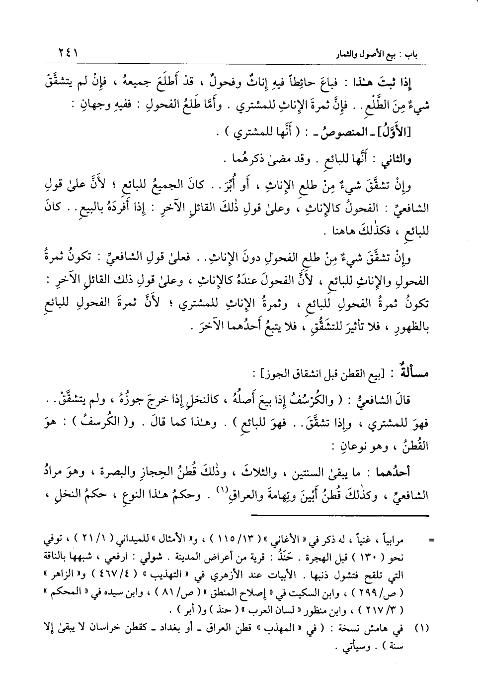 ] : قال الشافعي: (والكرسف إذا بيع أصله، كالنخل إذا خرج جوزه، ولم يتشقق.. فهو للمشتري، وإذا تشقق.. فهو للبائع) . وهذا كما قال. و (الكرسف) : هو القطن، وهو نوعان: