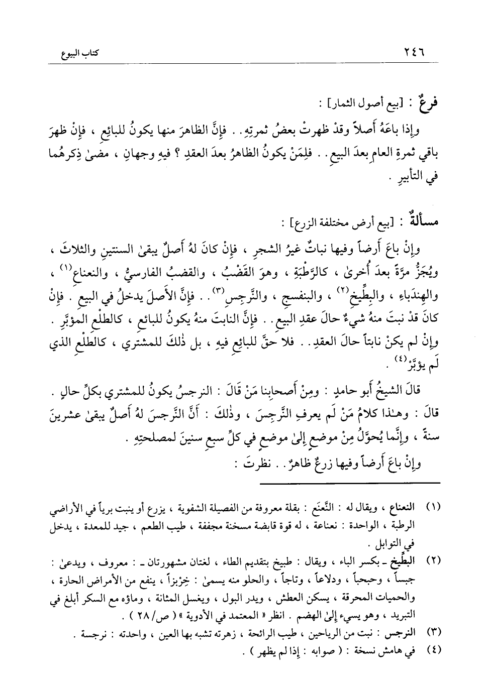 وإن باع أرضًا وفيها نبات غير الشجر، فإن كان له أصل يبقى السنتين والثلاث، ويجز مرة بعد أخرى، كالرطبة، وهو القضب، والقضب الفارسي، والنعناع، والهندباء، والبطيخ، والبنفسج، والنرجس.. فإن الأصل يدخل في البيع. فإن كان قد نبت منه شيء حال عقد البيع.. فإن النابت منه يكون للبائع، كالطلع المؤبر. وإن لم يكن نابتًا حال العقد.. فلا حق للبائع فيه، بل ذلك للمشتري، كالطلع الذي لم يؤبر.