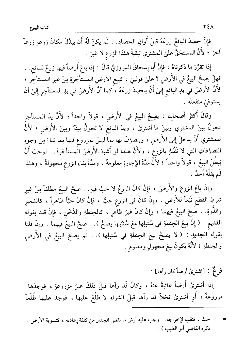 وقال أكثر أصحابنا: يصح البيع في الأرض، قولاً واحدًا؛ لأن يد المستأجر تحول بين المشتري وبين ما اشترى، ويد البائع لا تحول بينه وبين الأرض؛ لأن للمشتري أن يدخل إلى الأرض، ويتصرف بها بما ليس بمزروع فيها بما شاء من وجوه التصرفات التي لا تضر بالزرع، ولأن هذا لو أشبه الأرض المستأجرة.. لوجب أن يبطل البيع، قولاً واحدًا؛ لأن مدة الإجارة معلومة، ومدة بقاء الزرع مجهولة، وهذا لم يقله أحد.