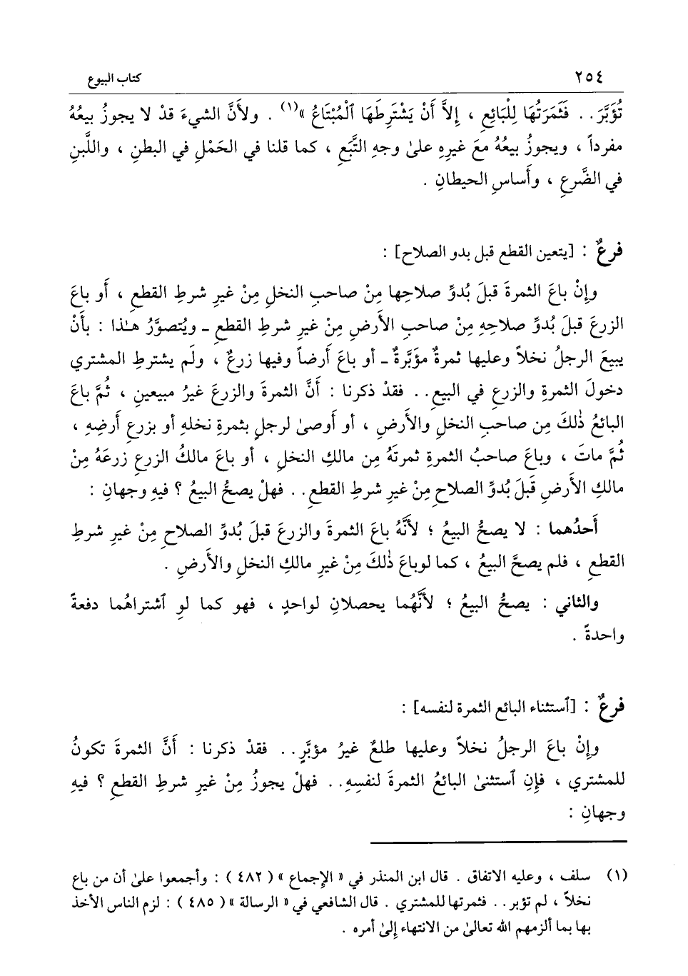 ] : وإن باع الرجل نخلاً وعليها طلعٌ غير مؤبر.. فقد ذكرنا: أن الثمرة تكون للمشتري، فإن استثنى البائع الثمرة لنفسه.. فهل يجوز من غير شرط القطع؟ فيه وجهان:
