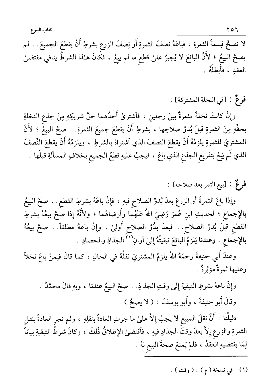 وإذا باع الثمرة أو الزرع بعد بدو الصلاح فيه، فإن باعه بشرط القطع.. صح البيع بالإجماع؛ لحديث ابن عمر - رَضِيَ اللَّهُ عَنْهُمَا - وأرضاهما؛ ولأنه إذا صح بيعه بشرط القطع قبل بدو الصلاح.. فبعد بدو الصلاح أولى. وإن باعه مطلقًا.. صح بيعه بالإجماع. وعندنا يلزم البائع تبقيته إلى أوان الجذاذ والحصاد.