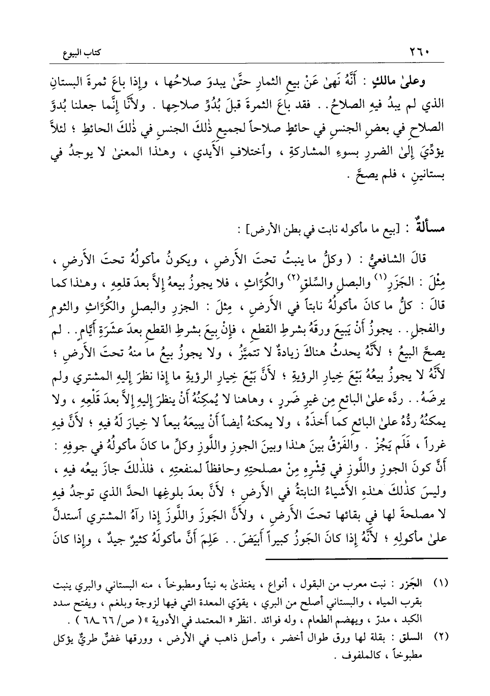 قال الشافعي: (وكل ما ينبت تحت الأرض، ويكون مأكوله تحت الأرض، مثل: الجزر والبصل والسلق والكراث، فلا يجوز بيعه إلا بعد قلعه، وهذا كما قال: كل ما كان مأكوله نابتًا في الأرض، مثل: الجزر والبصل والكرَّاث والثوم والفجل.. يجوز أن يبيع ورقه بشرط القطع، فإن بيع بشرط القطع بعد عشرة أيام.. لم يصح البيع؛ لأنه يحدث هناك زيادة لا تتميز، ولا يجوز بيع ما منه تحت الأرض؛ لأنه لا يجوز بيعه بيع خيار الرؤية؛ لأن بيع خيار الرؤية ما إذا نظر إليه المشتري ولم يرضه.. ردَّه على البائع من غير ضرر، وهاهنا لا يمكنه أن ينظر إليه إلا بعد قلعه، ولا يمكنه ردُّه على البائع كما أخذه، ولا يمكنه أيضًا أن يبيعه بيعًا لا خيار له فيه؛ لأن فيه غررًا، فلم يجز. والفرق بين هذا وبين الجوز واللوز وكل ما كان مأكوله في جوفه: أن كون الجوز واللوز في قشره من مصلحته وحافظًا لمنفعته، فلذلك جاز بيعه فيه، وليس كذلك هذه الأشياء النابتة في الأرض؛ لأن بعد بلوغها الحد الذي توجد فيه لا مصلحة لها في بقائها تحت الأرض؛ ولأن الجوز واللوز إذا رآه المشتري استدل على مأكوله؛ لأنه إذا كان الجوز كبيرًا أبيض.. علم أن مأكوله كثير جيد، وإذا كان