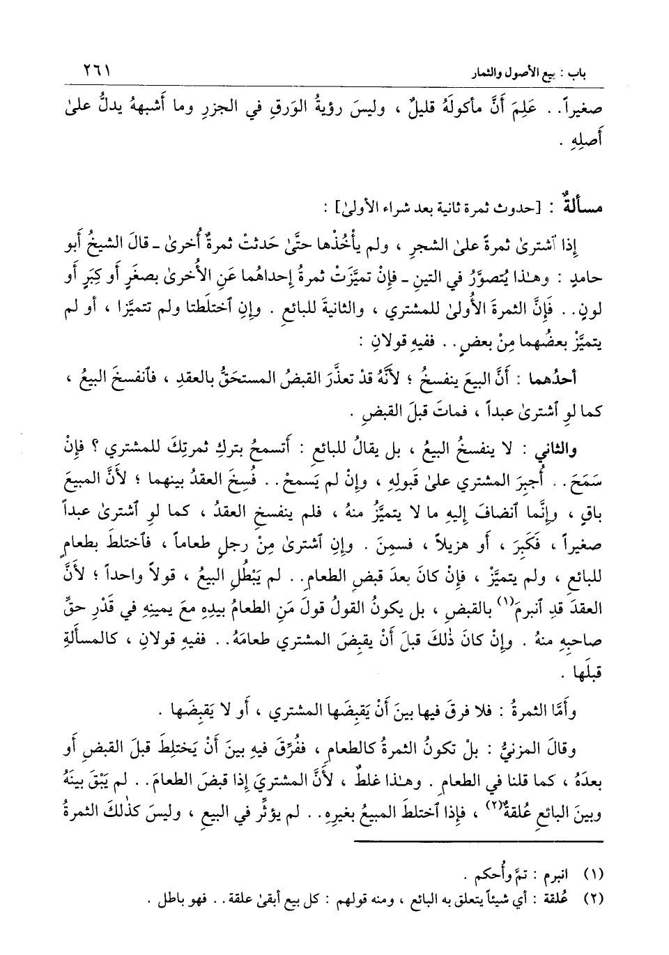 إذا اشترى ثمرة على الشجرة، ولم يأخذها حتى حدثت ثمرة أخرى ـ قال الشيخ أبو حامد: وهذا يتصور في التين ـ فإن تميزت ثمرة إحداهما عن الأخرى بصغر أو كبر أو لون.. فإن الثمرة الأولى للمشتري، والثانية للبائع. وإن اختلطتا ولم تتميزا، أو لم يتميز بعضها من بعض.. ففيه قولان: