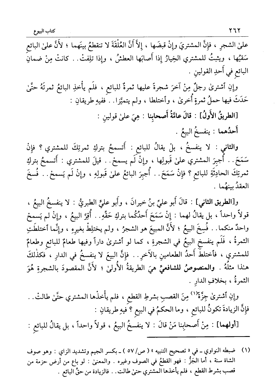 و [الطريق الثاني] : قال أبو علي بن خيران، وأبو علي الطبري: لا ينفسخ البيع، قولاً واحدًا، بل يقال لهما: إن سمح أحدكما بترك حقه.. أقر البيع، وإن لم يسمح واحدٌ منكما.. فسخ البيع؛ لأن المبيع هو الشجر، ولم يختلط بغيره، وإنما اختلطت الثمرة، فلم ينفسخ البيع في الشجرة، كما لو اشترى دارًا وفيها طعامٌ للبائع وطعام للمشتري، فاختلط أحد الطعامين بالآخر.. فإن البيع لا ينفسخ في الدار، فكذلك هذا مثله. والمنصوص للشافعي هي الطريقة الأولى؛ لأن المقصود بالشجرة هو الثمرة، بخلاف الدار.