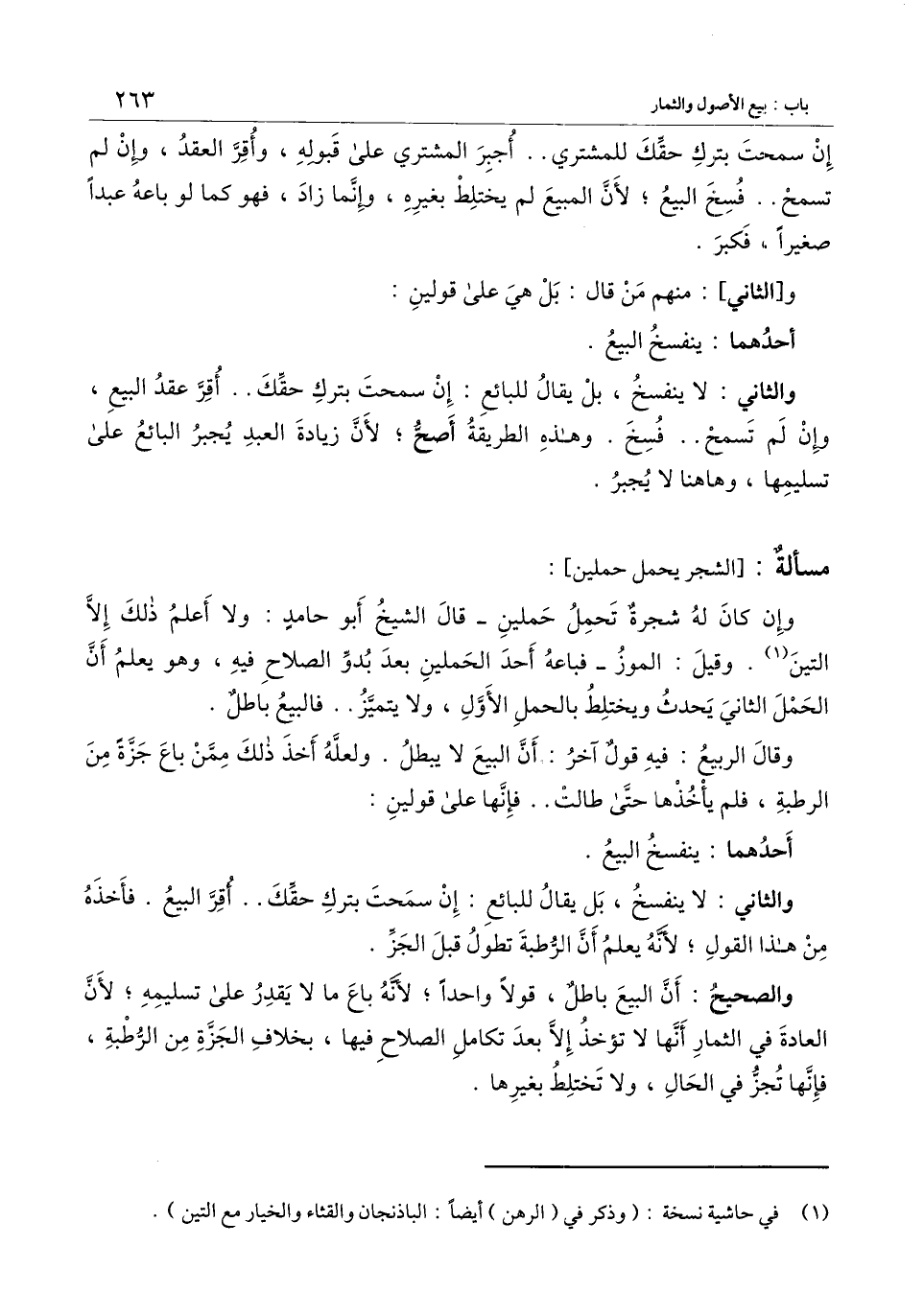 والثاني: لا ينفسخ، بل يقال للبائع: إن سمحت بترك حقك.. أقر البيع. فأخذه من هذا القول؛ لأنه يعلم أن الرطبة تطول قبل الجز.