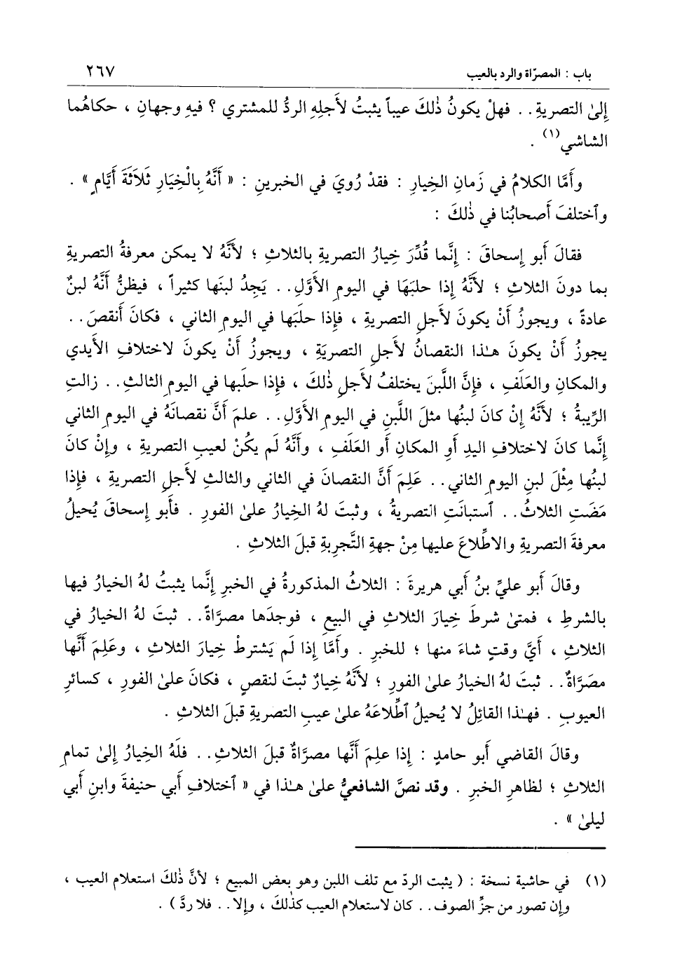 وقال أبو علي بن أبي هريرة: الثلاث المذكورة في الخبر إنما يثبت له الخيار فيها بالشرط، فمتى شرط خيار الثلاث في البيع، فوجدها مصراة.. ثبت له الخيار في الثلاث، أي وقت شاء منها؛ للخبر. وأما إذا لم يشترط خيار الثلاث، وعلم أنها مصراة.. ثبت له الخيار على الفور؛ لأنه خيار ثبت لنقص، فكان على الفور، كسائر العيوب. فهذا القائل لا يحيل اطلاعه على عيب التصرية قبل الثلاث.