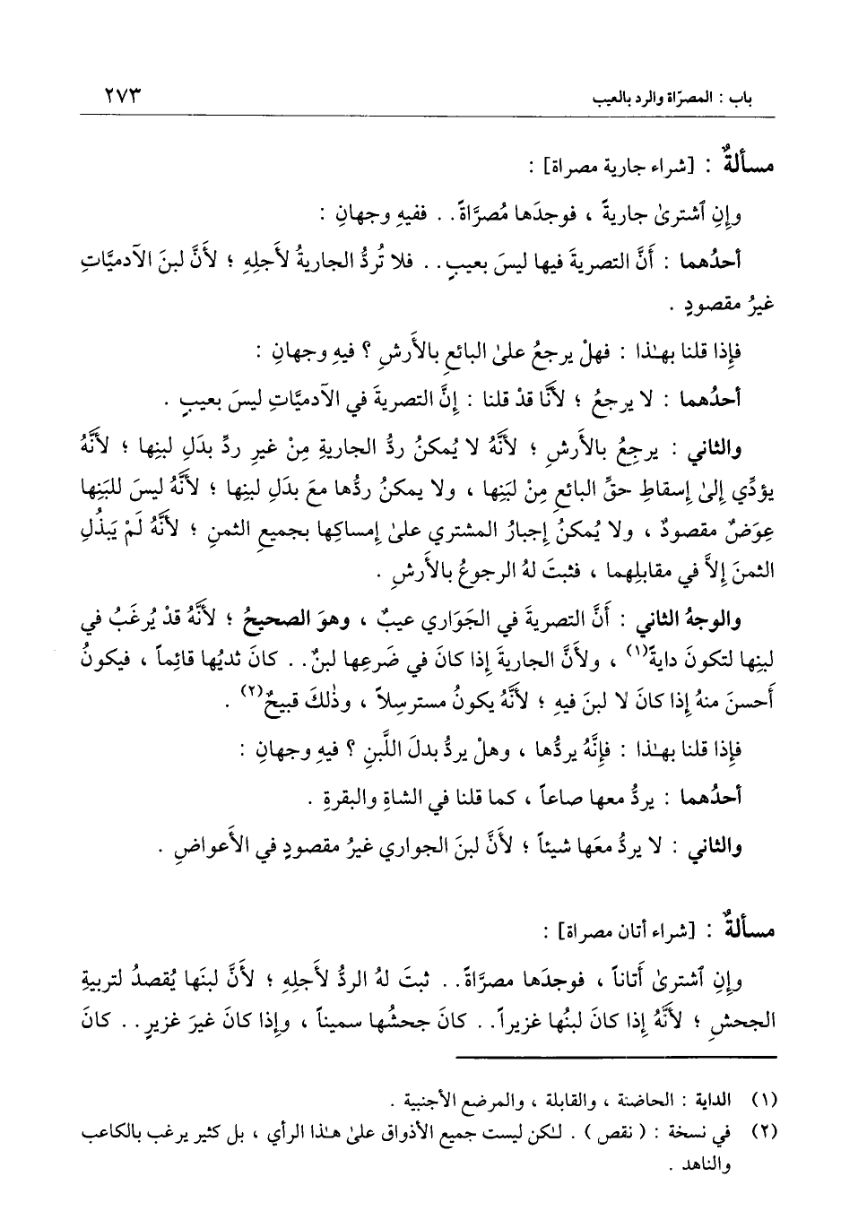 والوجه الثاني: أن التصرية في الجواري عيب، وهو الصحيح؛ لأنه قد يرغب في لبنها لتكون داية، ولأن الجارية إذا كان في ضرعها لبن.. كان ثديها قائمًا، فيكون أحسن منه إذا كان لا لبن فيه؛ لأنه يكون مسترسلا، وذلك قبيح.