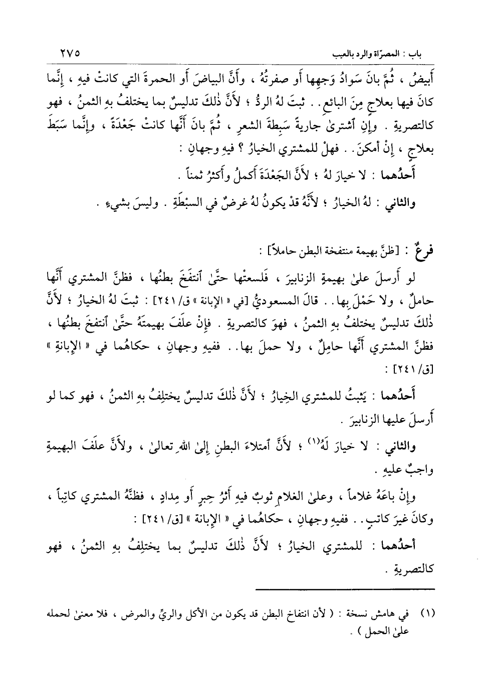 أبيض، ثم بان سواد وجهها أو صفرته، وأن البياض أو الحمرة التي كانت فيه، إنما كان فيها بعلاج من البائع.. ثبت له الرد؛ لأن ذلك تدليس بما يختلف به الثمن، فهو كالتصرية. وإن اشترى جارية سبطة الشعر، ثم بان أنها كانت جعدة، وإنما سبط بعلاج، إن أمكن.. فهل للمشتري الخيار؟ فيه وجهان: