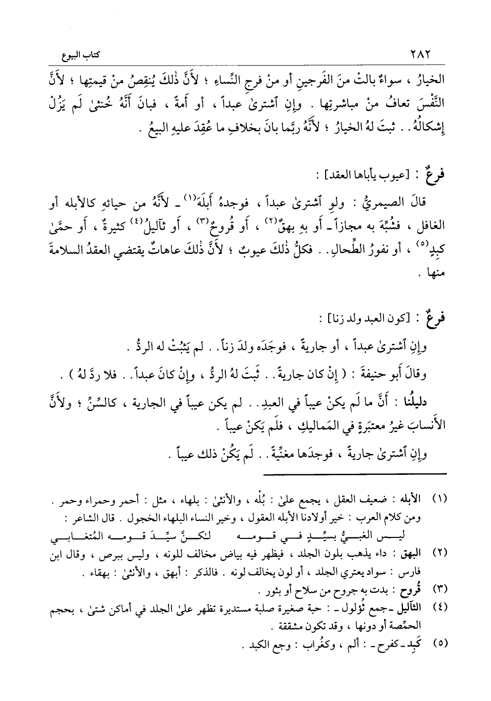 قال الصميري: ولو اشترى عبدًا، فوجده أبله ـ لأنه من حيائه كالأبله أو الغافل، فشبه به مجازًا ـ أو به بهقٌ، أو قروح، أو ثآليل كثيرة، أو حمى كبد، أو نفور الطحال.. فكل ذلك عيوب؛ لأن ذلك عاهات يقتضي العقد السلامة منها.