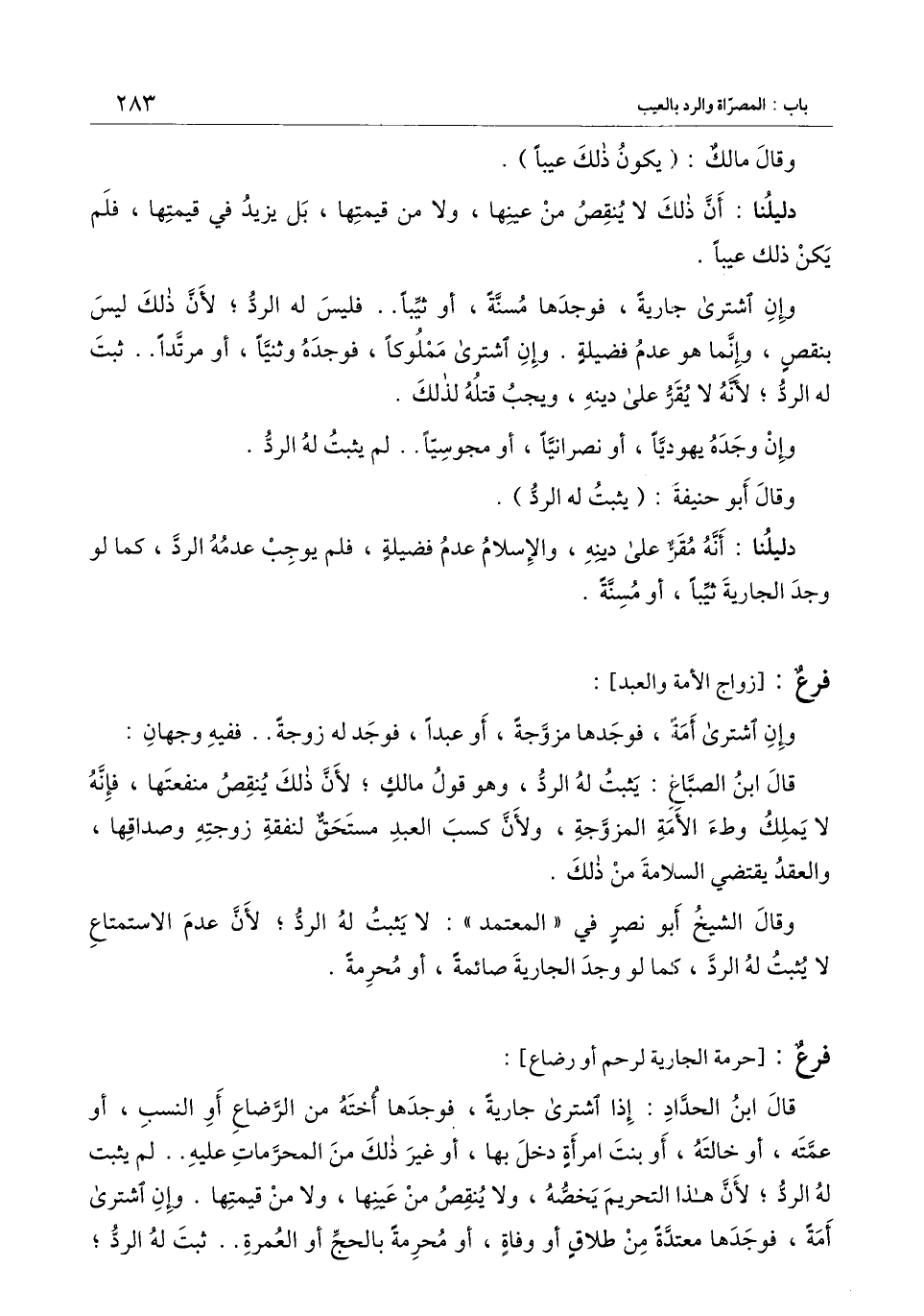 قال ابن الحدّاد: إذا اشترى جارية، فوجدها أخته من الرضاع أو النسب، أو عمته، أو خالته، أو بنت امرأة دخل بها، أو غير ذلك من المحرمات عليه.. لم يثبت له الرد؛ لأن هذا التحريم يخصه، ولا ينقص من عينها، ولا من قيمتها. وإن اشترى أمة، فوجدها معتدة من طلاق أو وفاة، أو محرمة بالحج أو العمرة.. ثبت له الرد؛