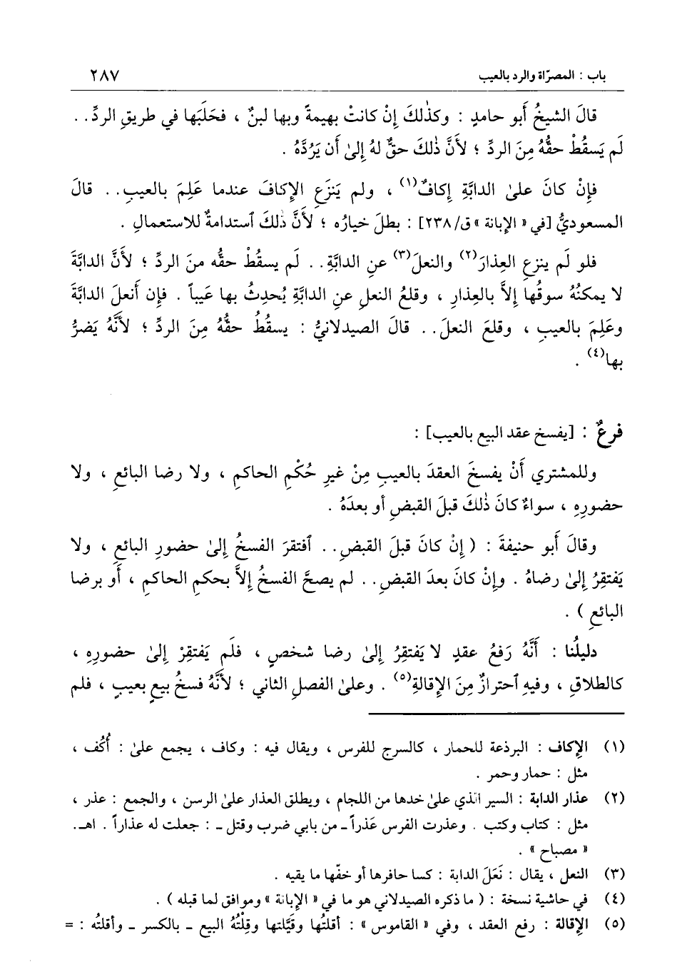 فلو لم ينزع العذار والنعل عن الدابة.. لم يسقط حقه من الرد؛ لأن الدابة لا يمكنه سوقها إلا بالعذار، وقلع النعل عن الدابة يحدث بها عيبًا. فإن أنعل الدابة وعلم بالعيب، وقلع النعل.. قال الصيدلاني: يسقط حقه من الرد؛ لأنه يضر بها.