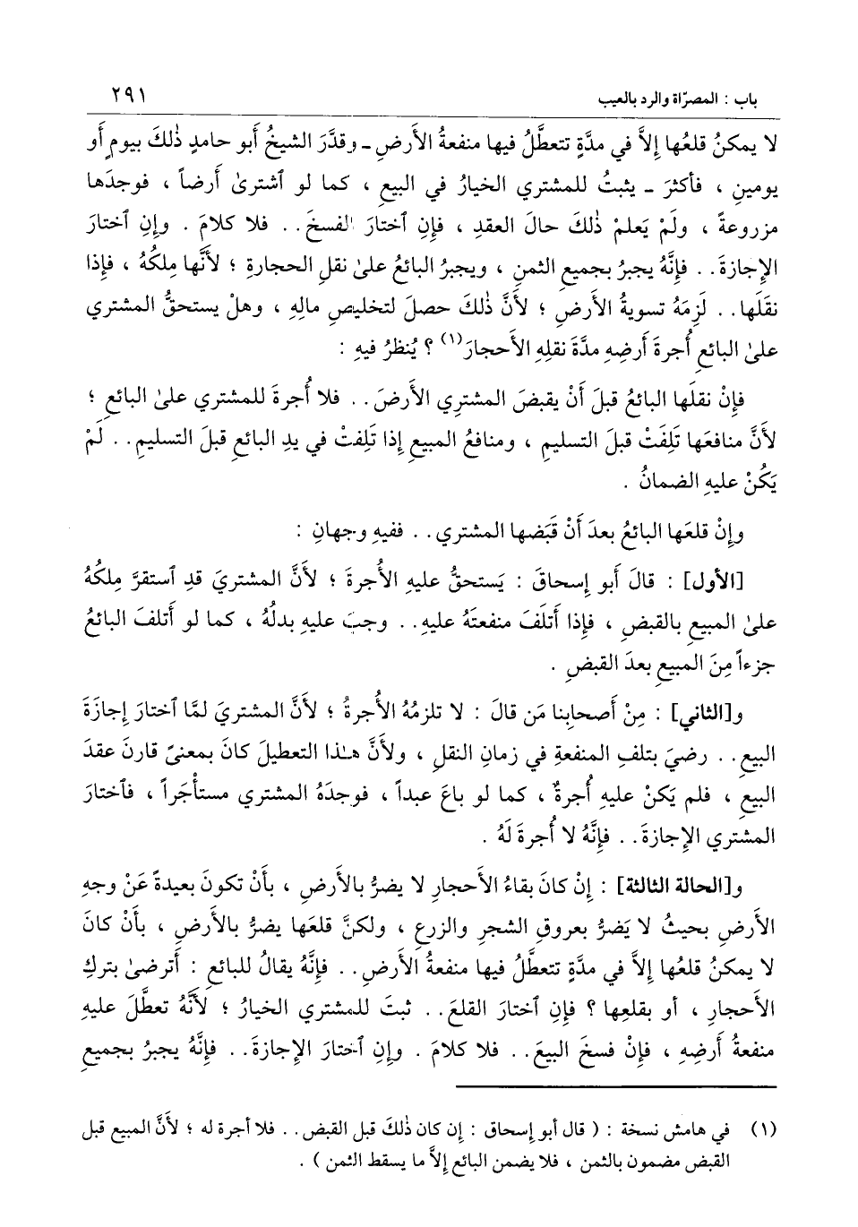 و [الحالة الثالثة] : إن كان بقاء الأحجار لا يضر بالأرض، بأن تكون بعيدة عن وجه الأرض بحيث لا يضر بعروق الشجر والزرع، ولكن قلعها يضر بالأرض، بأن كان لا يمكن قلعها إلا في مدة تتعطل فيها منفعة الأرض.. فإنه يقال للبائع: أترضى بترك الأحجار، أو بقلعها؟ فإن اختارا القلع.. ثبت للمشتري الخيار؛ لأنه تعطل عليه منفعة أرضه، فإن فسخ البيع.. فلا كلام. وإن اختار الإجازة.. فإنه يجبر بجميعِ