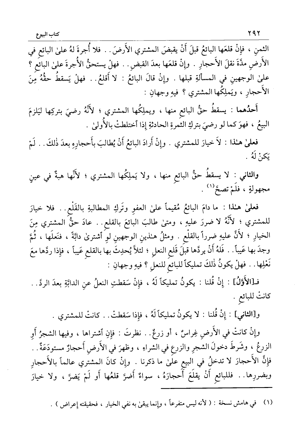 فعلى هذا: ما دام البائع مقيما على العفو وترك المطالبة بالقلع.. فلا خيار للمشتري؛ لأنه لا ضرر عليه، ومتى طالب البائع بالقلع.. عاد حق المشتري من الخيار؛ لأن عليه ضررا بالقلع. ومثل هذين الوجهين: لو اشترى دابة، فنعلها ثم وجد بها عيبًا.. فله أن يردها قبل قلع النعل؛ لئلا يحدث بها بالقلع عيبًا، فإذا ردّها مع نعلها.. فهل يكون ذلك تمليكًا للبائع للنعل؟ فيه وجهان: