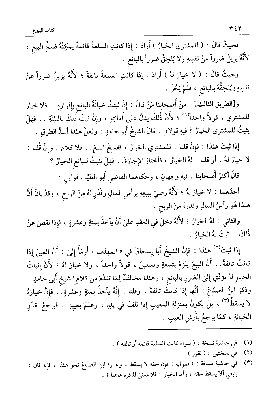 إذا ثبت هذا: فإن الشيخ أبا إسحاق في " المهذب " أومأ إلى: أن العين إذا كانت تالفةً.. أن البيع يلزم بتسعة وتسعين، قولاً واحدًا، ولا خيار له؛ لأن إثبات الخيار له يؤدي إلى الضرر بالبائع، وهذا مخالفٌ لما تقدم من كلام الشيخ أبي حامد. وذكر ابن الصبّاغ: أنها إذا كانت تالفةً، وقلنا: إنه يأخذ بمائة وعشرة.. فإن خياره لا يسقط، بل يكون بمنزلة المعيب إذا تلف في يده، وعلم بعيبه.. فيرجع بقدر الخيانة، كما يرجع بأرش العيب.