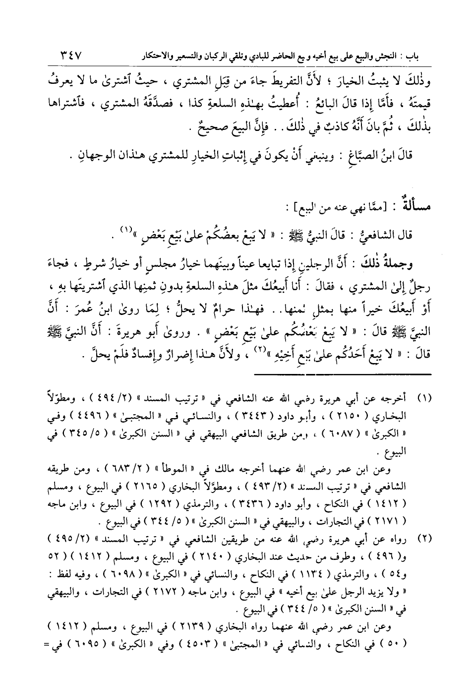 قال الشافعي: قال النبي - صَلَّى اللَّهُ عَلَيْهِ وَسَلَّمَ -: «لا يبع بعضكم على بيع بعض» .