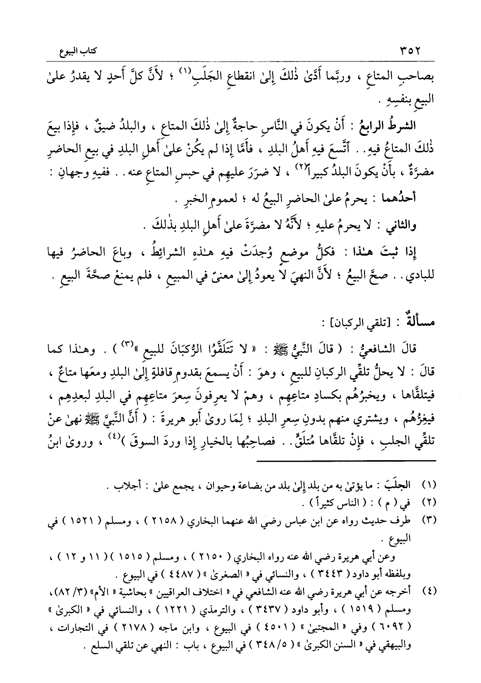 قال الشافعي: (قال النبي - صَلَّى اللَّهُ عَلَيْهِ وَسَلَّمَ -: «لا تتلقّوا الركبان للبيع» . وهذا كما قال: لا يحل تلقي الركبان للبيع، وهو: أن يسمع بقدوم قافلة إلى البلد ومعها متاع فيتلقاها، ويخبرهم بكساد متاعهم، وهم لا يعرفون سعر متاعهم في البلد؛ لبعدهم، فيغرُّهم، ويشتري منهم بدون سعر البلد؛ لما روى أبو هريرة: «أن النبي - صَلَّى اللَّهُ عَلَيْهِ وَسَلَّمَ - نهى عن تلقِّي الجلب، فإن تلقّاها متلقٍّ.. فصاحبها بالخيار إذا ورد السوق» ، وروى ابن