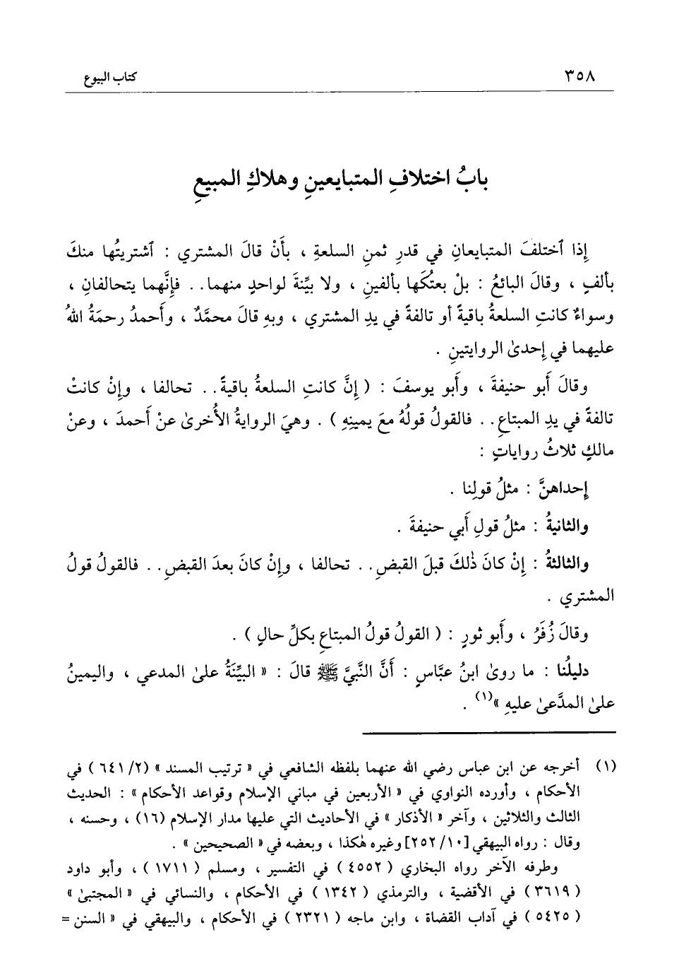 وقال أبو حنيفة، وأبو يوسف: (إن كانت السلعة باقية.. تحالفا، وإن كانت تالفةً في يد المبتاع.. فالقول قوله مع يمينه) . وهي الرواية الأخرى عن أحمد، وعن مالك ثلاث روايات: