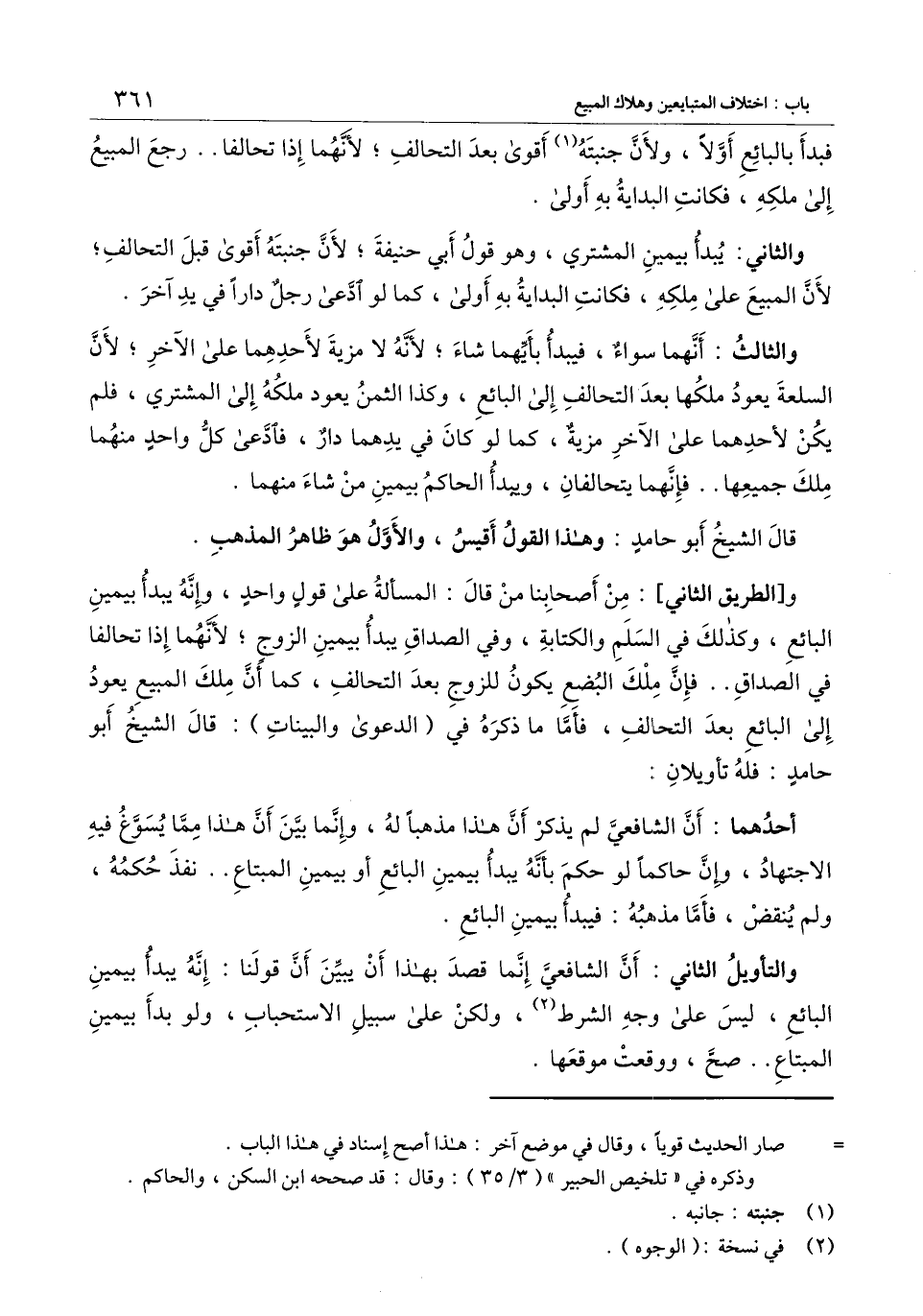 أحدُهما: أنّ الشافعي لم يذكر أن هذا مذهبًا له، وإنّما بيّن أن هذا مما يسوّغ فيه الاجتهاد، وإن حاكمًا لو حكم بأنه يبدأ بيمين البائع أو بيمين المبتاع.. نفذ حكمه، ولم ينقض، فأما مذهبه: فيبدأ بيمين البائع.