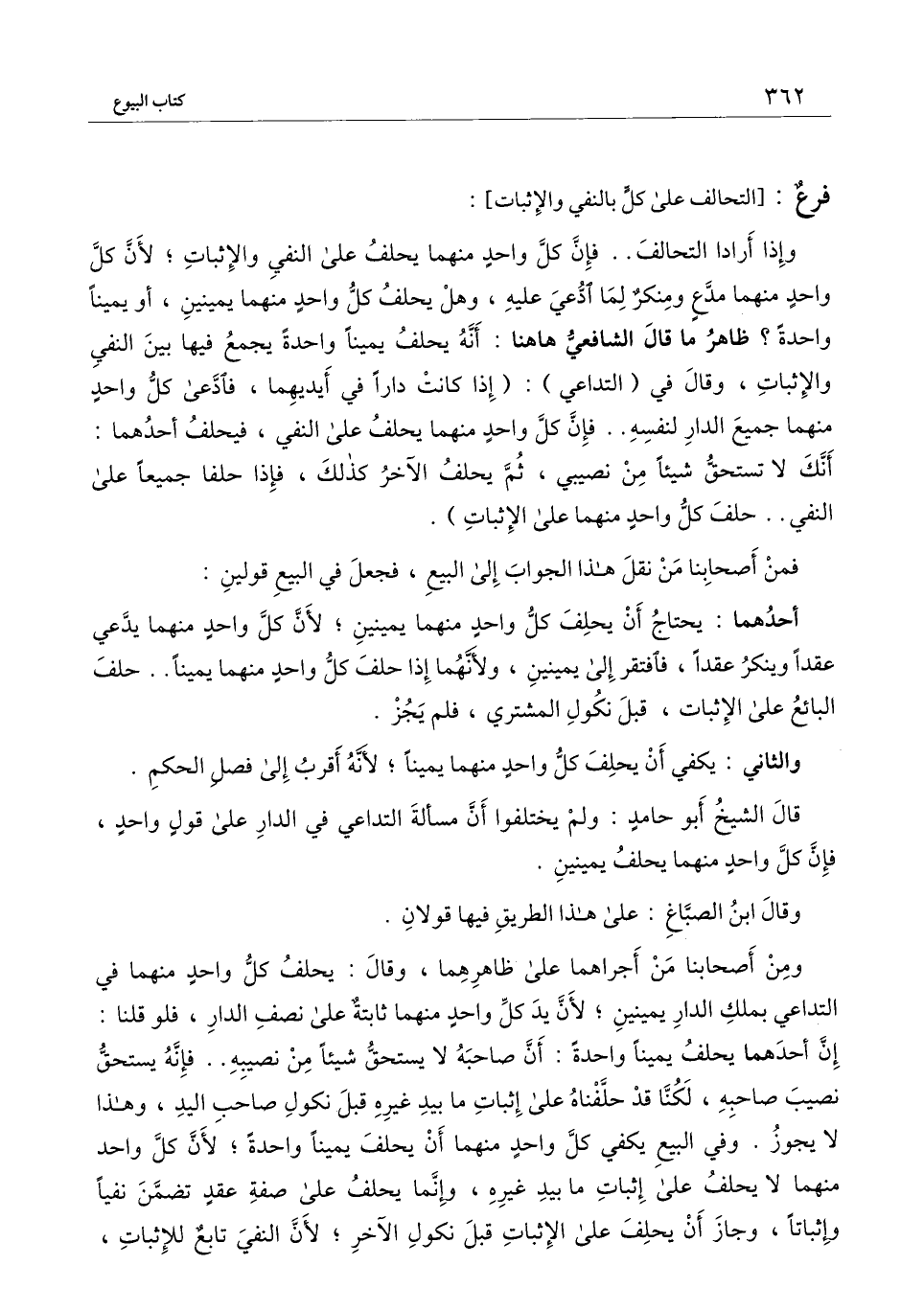 ومن أصحابنا من أجراهما على ظاهرهما، وقال: يحلف كل واحد منهما في التداعي بملك الدار يمينين؛ لأن يد كل واحد منهما ثابتة على نصف الدار، فلو قلنا: إن أحدهما يحلف يمينًا واحدةً: أنّ صاحبه لا يستحق شيئًا من نصيبه.. فإنه يستحق نصيب صاحبه، لكُنَّا قد حلّفناه على إثبات ما بيد غيره قبل نكول صاحب اليد، وهذا لا يجوز. وفي البيع يكفي كل واحد منهما أن يحلف يمينًا واحدةً؛ لأن كل واحد منهما لا يحلف على إثبات ما بيد غيره، وإنما يحلف على صفة عقد تضمّن نفيًا وإثباتًا، وجاز أن يحلف على الإثبات قبل نكول الآخر؛ لأن النفي تابع للإثبات،