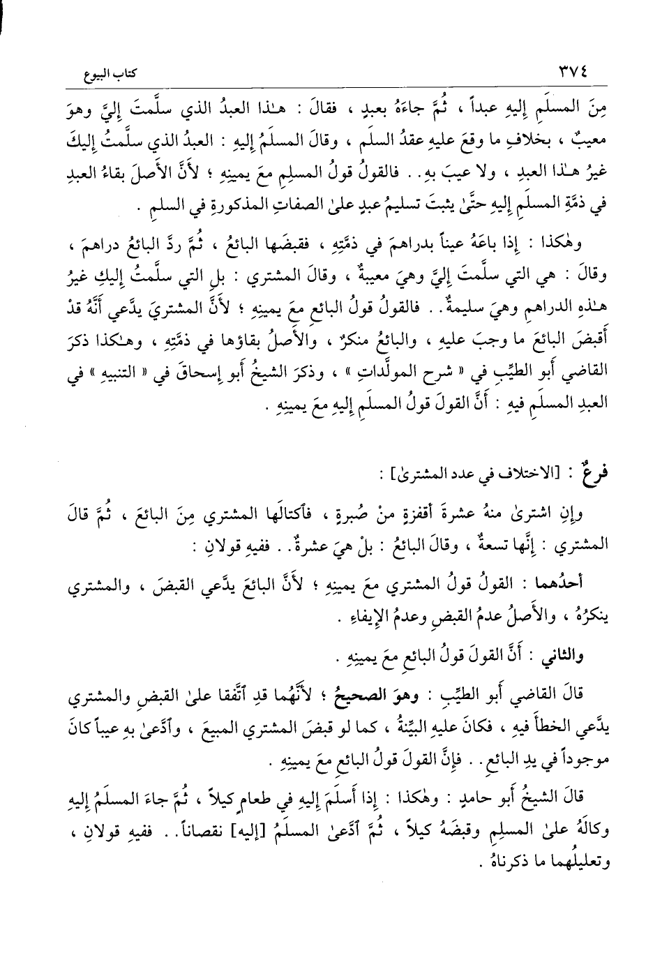 من المسلم إليه عبدًا، ثم جاءه بعبد، فقال: هذا العبد الذي سلّمت إليّ وهو معيبٌ، بخلاف ما وقع عليه عقد السلم، وقال المسلم إليه: العبد الذي سلّمت إليك غير هذا العبد، ولا عيب به.. فالقول قول المسلم مع يمينه؛ لأن الأصل بقاء العبد في ذمة المسلم إليه حتى يثبت تسليم عبدٍ على الصفات المذكورة في السلم.