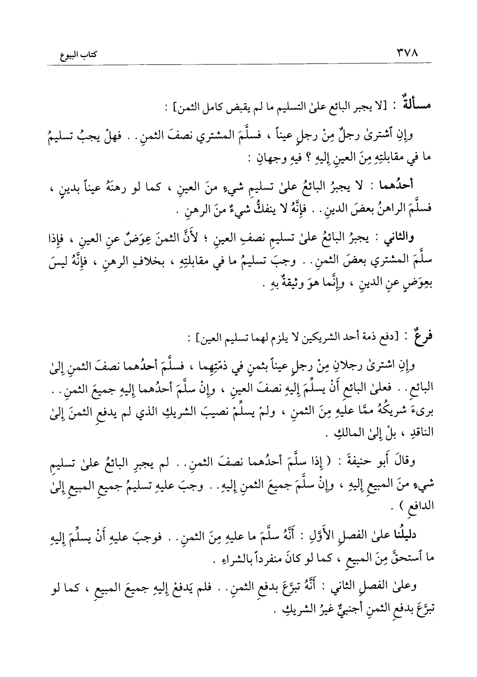 ] : وإن اشترى رجلان من رجل عينًا بثمن في ذمّتهما، فسلّم أحدهما نصف الثمن إلى البائع.. فعلى البائع أن يسلم إليه نصف العين، وإن سلّم أحدهما إليه جميع الثمن.. بريء شريكه ممَّا عليه من الثمن، ولم يسلِّم نصيب الشريك الذي لم يدفع الثمن إلى الناقد، بل إلى المالك.