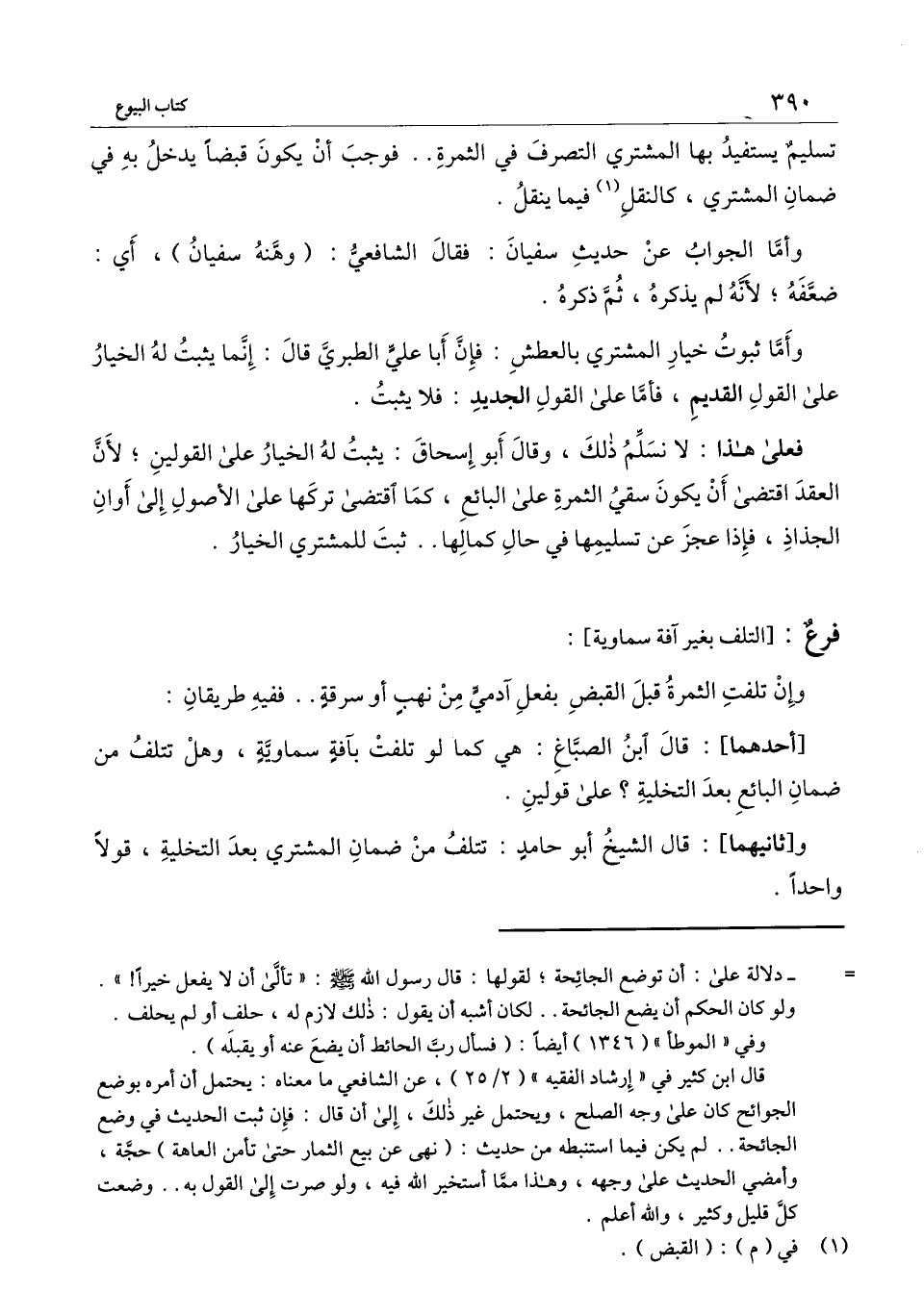 [أحدهما] : قال ابن الصبّاغ: هي كما لو تلفت بآفة سماويّة، وهل تتلف من ضمان البائع بعد التخلية؟ على قولين.