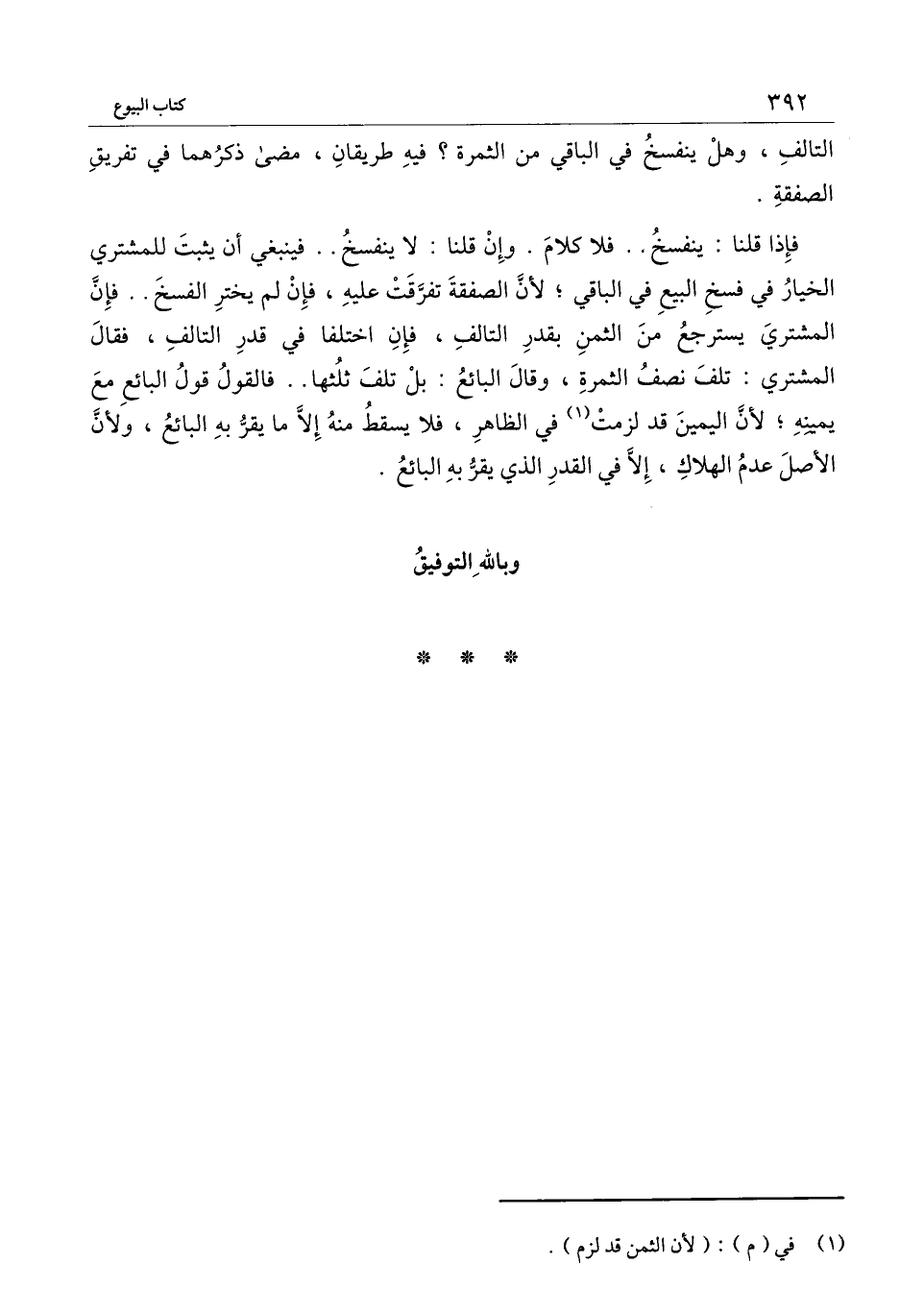 فإذا قلنا: ينفسخ.. فلا كلام. وإن قلنا: لا ينفسخ.. فينبغي أن يثبت للمشتري الخيار في فسخ البيع في الباقي؛ لأن الصفقة تفرَّقت عليه، فإن لم يختر الفسخ.. فإنَّ المشتري يسترجع من الثمن بقدر التالف، فإن اختلفا في قدر التالف، فقال المشتري: تلف نصف الثمرة، وقال البائع: بل تلف ثلثها.. فالقول قول البائع مع يمينه؛ لأن اليمين قد لزمت في الظاهر، فلا يسقط منه إلاَّ ما يقرُّ به البائع، ولأن الأصل عدم الهلاك، إلاَّ في القدر الذي يقرُّ به البائع.