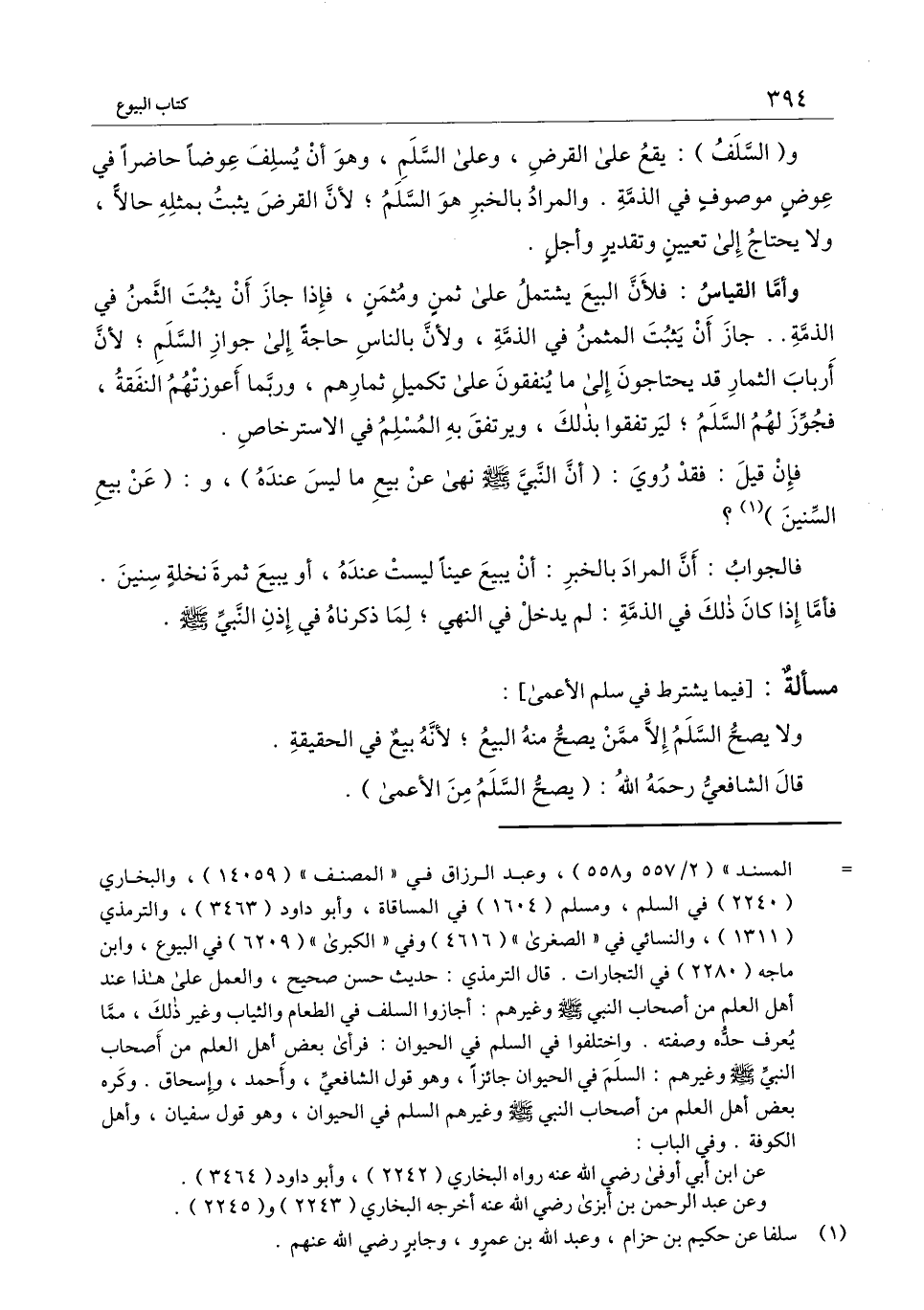 فالجواب: أن المراد بالخبر: أن يبيع عينًا ليست عنده، أو يبيع ثمرة نخلةٍ سنين. فأمَّا إذا كان ذلك في الذمة: لم يدخل في النهي؛ لما ذكرناه في إذن النبي - صَلَّى اللَّهُ عَلَيْهِ وَسَلَّمَ -.