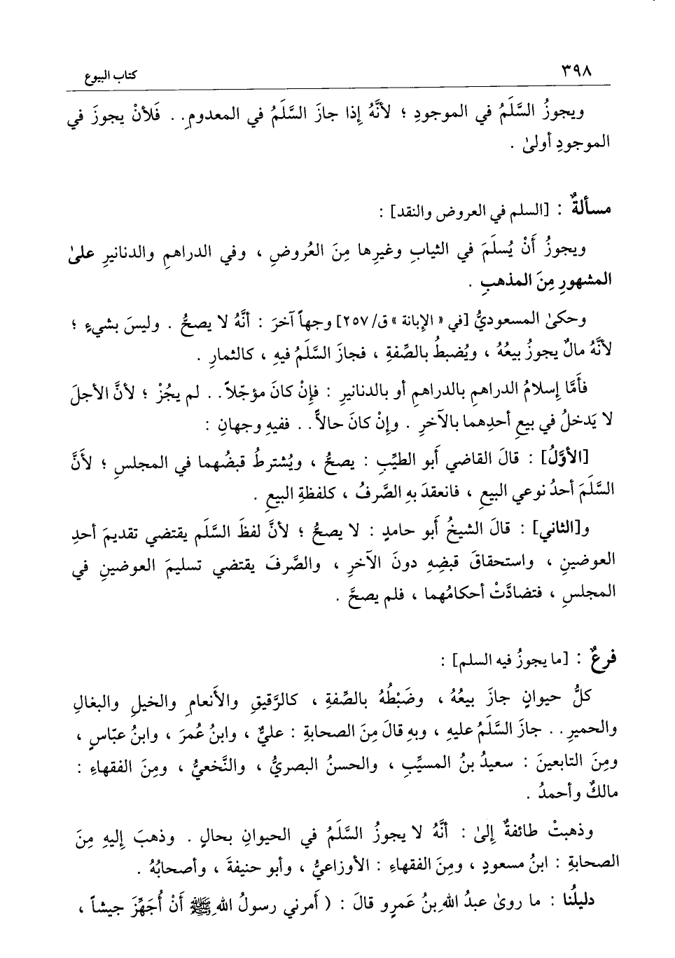 ] : كلُّ حيوان جاز بيعه، وضبطه بالصفة، كالرقيق والأنعام والخيل والبغال والحمير.. جاز السلم عليه، وبه قال من الصحابة: عليٌّ، وابن عمر، وابن عبّاس، ومن التابعين: سعيد بن المسيِّب، والحسن البصريُّ، والنَّخعيُّ، ومن الفقهاء: مالك وأحمد.
