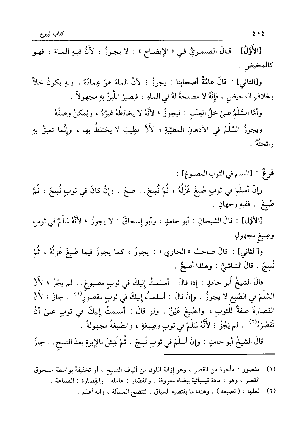 قال الشيخ أبو حامد: إذا قال: أسلمت إليك في ثوب مصبوغ.. لم يجز؛ لأن السلم في الصبغ لا يجوز. وإن قال: أسلمت إليك في ثوب مقصور.. جاز؛ لأن القصارة صفة للثوب، والصبغ عين. ولو قال: أسلمت إليك في ثوب على أن تقصره.. لم يجز؛ لأنه سلم في ثوب وصبغة، والصبغة مجهولة.