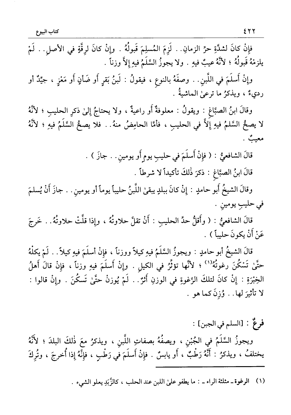 وقال ابن الصبّاغ: ويقول: معلوفة أو راعية، ولا يحتاج إلى ذكر الحليب؛ لأنه لا يصح السلم فيه إلا في الحليب، فأمّا الحامض منه.. فلا يصح السلم فيه؛ لأنه معيب.