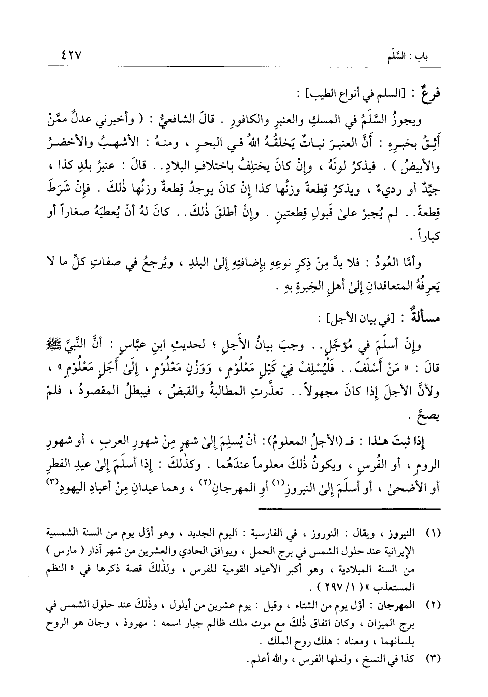 إذا ثبت هذا: فـ (الأجل المعلوم) : أن يسلم إلى شهر من شهور العرب، أو شهور الروم، أو الفرس، ويكون ذلك معلومًا عندهما. وكذلك: إذا أسلم إلى عيد الفطر أو الأضحى، أو أسلم إلى النيروز أو المهرجان، وهما عيدان من أعياد اليهود