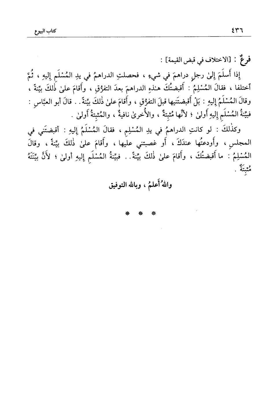 ] : إذا أسلم إلى رجل دراهم في شيء، فحصلت الدراهم في يد المسلم إليه، ثم اختلفا، فقال المسلم: أقبضتك هذه الدراهم بعد التفرق، وأقام على ذلك بينة، وقال المسلم إليه: بل أقبضتنيها قبل التفرق، وأقام على ذلك بينة.. قال أبو العباس: فبينة المسلم إليه أولى؛ لأنها مثبتة، والأخرى نافية، والمثبتة أولى.