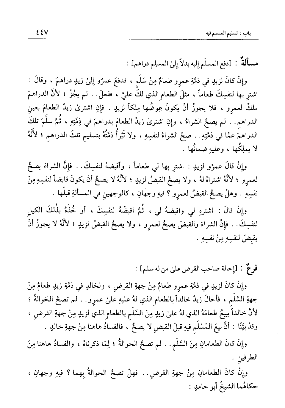 ] : وإن كان لزيد في ذمة عمرو طعام من سلم، فدفع عمرو إلى زيد دراهم، وقال اشتر بها لنفسك طعامًا، مثل الطعام الذي لك عليَّ، ففعل.. لم يجز؛ لأن الدراهم ملك لعمرو، فلا يجوز أن يكون عوضها ملكًا لزيد. فإن اشترى زيد الطعام بعين الدراهم.. لم يصح الشراء، وإن اشترى زيدٌ الطعام بدراهم في ذمته، ثم سلَّم تلك الدراهم عمّا في ذمّته.. صح الشراء لنفسه، ولا تبرأ ذمته بتسليم تلك الدراهم؛ لأنه لا يملكها، وعليه ضمانها. وإن قال عمرٌو لزيد: اشتر بها لي طعامًا، واقبضه لنفسك.. فإن الشراء يصح لعمرو؛ لأنه اشتراه له، ولا يصح القبض لزيد؛ لأنه لا يصح أن يكون قابضًا لنفسه من نفسه. وهل يصح القبض لعمرٍو؟ فيه وجهان، كالوجهين في المسألة قبلها.