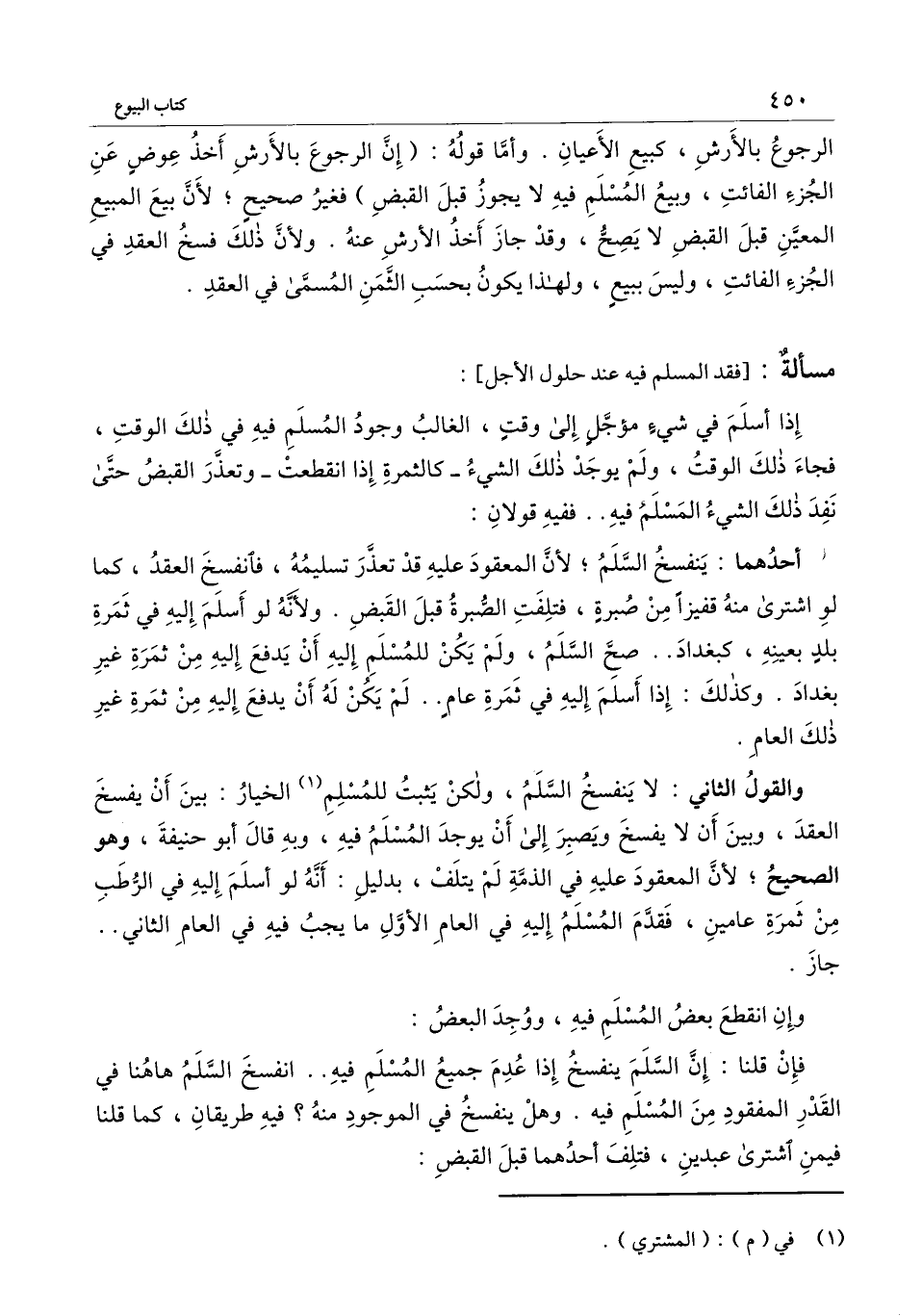 الرجوع بالأرش، كبيع الأعيان. وأمَّا قوله: (إن الرجوع بالأرش أخذ عوض عن الجزء الفائت، وبيع المسلم فيه لا يجوز قبل القبض) فغير صحيح؛ لأن بيع المبيع المعيَّن قبل القبض لا يصح، وقد جاز أخذ الأرش عنه. ولأن ذلك فسخ العقد في الجزء الفائت، وليس ببيع، ولهذا يكون بحسب الثمن المسمى في العقد.