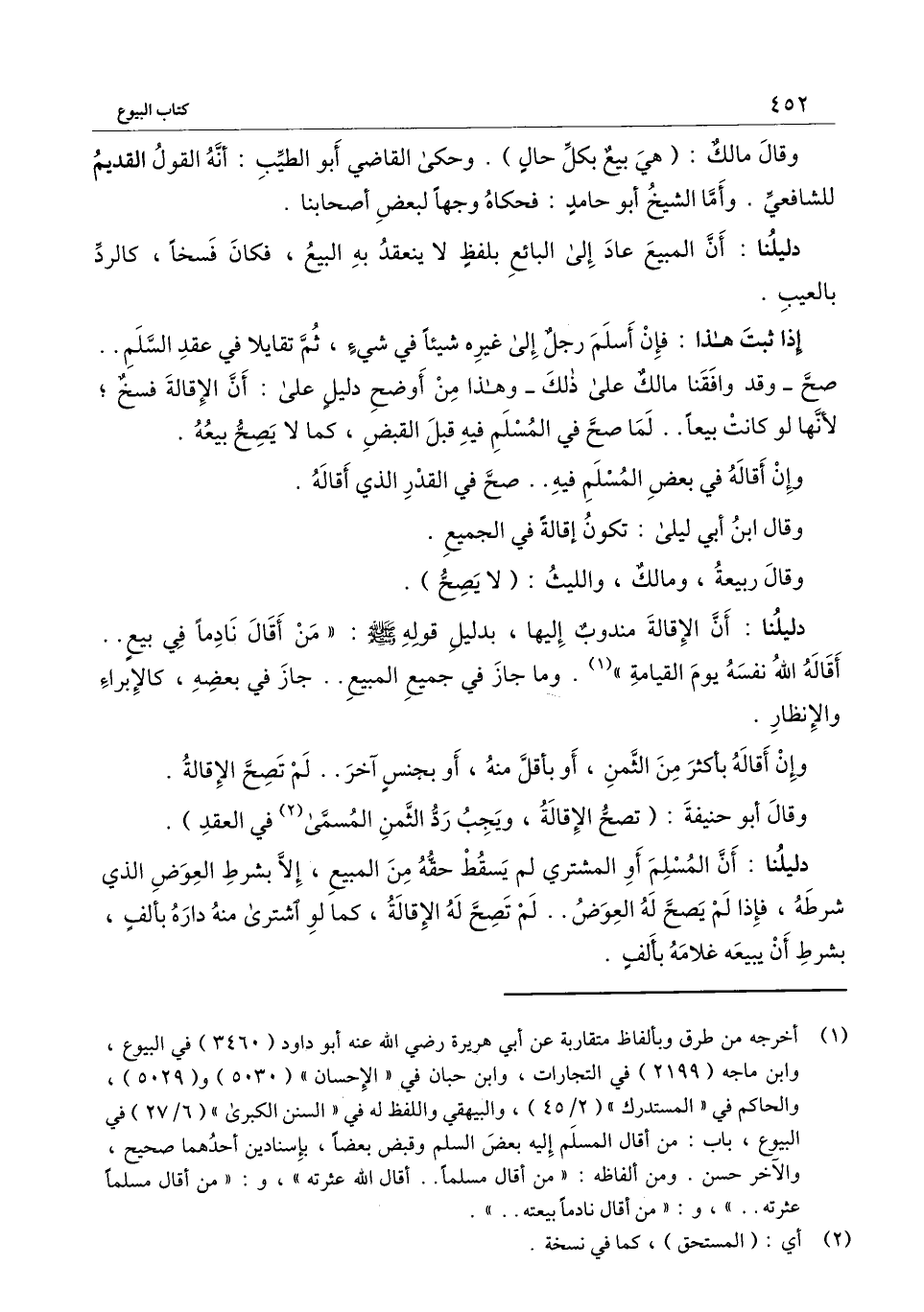 دليلنا: أن الإقالة مندوبٌ إليها، بدليل قوله - صَلَّى اللَّهُ عَلَيْهِ وَسَلَّمَ -: «من أقال نادمًا في بيع.. أقاله الله نفسه يوم القيامة» . وما جاز في جميع المبيع.. جاز في بعضه، كالإبراء والإنظار.